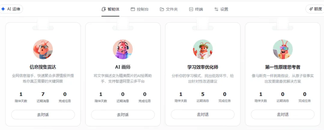 最近搭建了一个AI团队,简单和大家分享一下一个多月前开始折腾自己的 OpenClaw,那时候天天研究怎么给 AI 写规则、调教它,磨合了好一阵子,终于能帮我干点靠谱的活了。但那时候一个号只能建一个助手,想多训几个还得折腾小号,挺麻烦的。 这两天发现飞书出了 AI 团队功能,正好有空,我立马就去试了试。今天把搭建过程和感受分享给大家,感兴趣的朋友可以自己动手试试。 我的AI团队,现在长这样 说干就干,我在飞书建了个群,拉出来我的第一支AI队伍。目前阵容是这样: 🧠马云思维教练 用马云的商业思维帮你拆解创业问题,每次卡壳做决策的时候,找他聊两句,总能蹦出新想法。 📡信息搜集雷达 全网搜索整理资料,我写文章找素材、做项目摸背景,把需求一丢,分分钟给你整理好,效率比我自己搜高十倍都不止。 🎨AI画师 说清楚你想要啥,直接给你生成图片。写文章要配图、找灵感、做PPT要背景图,找它就对了。 ⚡学习效率优化师 帮你梳理学习路径,优化方法,提升效率。想学点新东西,先让它给你规划一下,少走好多弯路。 ⚖️第一性原理思考者 遇到复杂问题,帮你抽丝剥茧找本质。好多时候我们想不明白,其实就是被表象给迷惑了。 🔧Agent编排工程师(队长) 这个是队长!复杂任务交给它,它会根据每个AI的特长分配工作,组织大家一起讨论,最后给我一个整合好的结果。 怎么让AI团队干活?其实超简单 操作真的没你想的那么复杂,我就是建了个群,把每个AI助手拉进去,就搞定了: 有事直接@ :比如我要找资料,直接@信息搜集雷达,说清楚要啥,它就动起来了。复杂任务找队长 :如果一个活需要好几个AI配合,我就丢给队长,剩下的它来安排。定期对齐颗粒度 :我让队长定期组织大家"开个会",同步一下任务进展,避免重复干活、衔接不上。这里给大家分享个小经验:搭AI团队别一开始就追求"大而全",先从你最常用的需求入手。比如你经常写东西,那就先搭信息搜集+AI画师;经常要做决策,就先来思维教练+第一性原理思考者,用着用着慢慢加,逐步完善就好。 我现在是把感兴趣的角色先都建一个,用一段时间,好用的留下,不好用的就换掉,慢慢就能搭配出最适合自己的组合。 整个过程体验真的很爽——你不用管人,不用协调人际关系,不用操心谁情绪不好了、谁是不是摸鱼了。需要用的时候喊一声,立马开工。对我这种不太喜欢复杂人情世故的人来说,太友好了。 这套玩法,最适合这四类人 不喜欢复杂人际关系的人像我一样,懒得应酬,懒得搞办公室政治,那就自己搭个AI团队玩,清净。 暂时还没机会管真实团队的人没关系,先从管理AI团队开始练手,思路其实是一样的。 自由职业者/独立创作者一个人就是一支队伍,不同的活交给不同专长的AI,你只需要专注在最有创造力的部分就行。 想提高效率的上班族把重复的、搜集整理类的工作丢给AI,自己省出时间去做更重要的事。 其实不管你是职场人、创业者还是学生,都能搭一个自己的AI团队:职场人可以用来处理报表、整理资料、优化流程;创业者可以做行业分析、搜集信息、统筹任务;学生可以优化学习方法、整理笔记、解答难题。大家可以选择适合自己的模版也可以自己自定义。 而且!重点来了,现在有个超级福利——整个4月份飞书AI资源都是限免的 ,截止到4月30日,使用过程中不用花一分钱,后续什么时候收费会另行通知。 我敢这么大胆尝试,就是冲着这个福利去的,零成本试错,就算搭得不满意,也没什么损失。等以后功能成熟了,大概率就要收费了,所以现在正是体验的最佳时机。 说句实在话,现在还不完美 坦诚说,我的AI团队现在还处在起步阶段,一直在磨合调整。有时候AI响应不够精准,有时候队长任务分配也不太合理,但这些都是可以慢慢优化的——调调指令、改改规则,慢慢就会越来越贴合你的需求。 虽然说一切才刚刚开始,配合起来还不是那么丝滑,有些角色定位还在优化,但这已经是一个超级好的开始了。 以前我一个人要干所有活:写稿、找图、搜资料、理逻辑,换来换去,注意力特别容易被打断。现在不一样了,这些杂活都分给专精的AI去做,我只需要把握大方向,做我真正感兴趣的思考和创造就行。 说白了,这其实就是把你的大脑"外化"出来 ,让不同的AI负责不同的思维模块,你当CEO,只需要做决策和拍板。 接下来我打算这么玩 加几个新角色,比如文案润色师 、标题设计师 ,还有专门唱反调挑毛病的反驳者 如果你看了也心动了,不妨花十几分钟在飞书搭一个试试?反正现在几乎零成本。 说不定,你的AI团队就能帮你打开一扇新世界的大门。 你试过搭自己的AI团队吗?有什么好玩的玩法,欢迎在评论区聊聊~