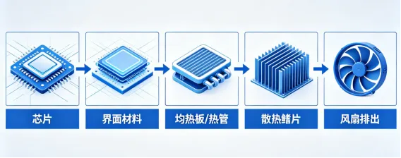 设备内部的热量传递,是一场标准 “接力赛”:芯片 → 界面材料 → 均热板 / 热管 → 散热鳍片 → 风扇排出