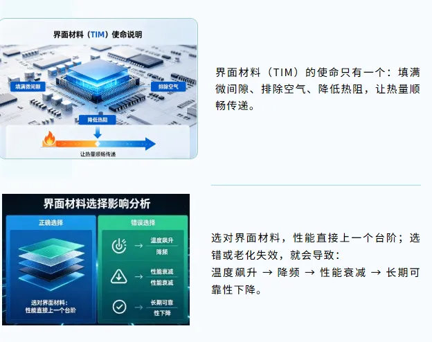 芯片与散热件之间不可能 100% 完美贴合,表面微观凹凸、翘曲、装配公差都会形成空气间隙。而空气导热极差,会直接造成高热阻、热量堵在芯片里散不出去。