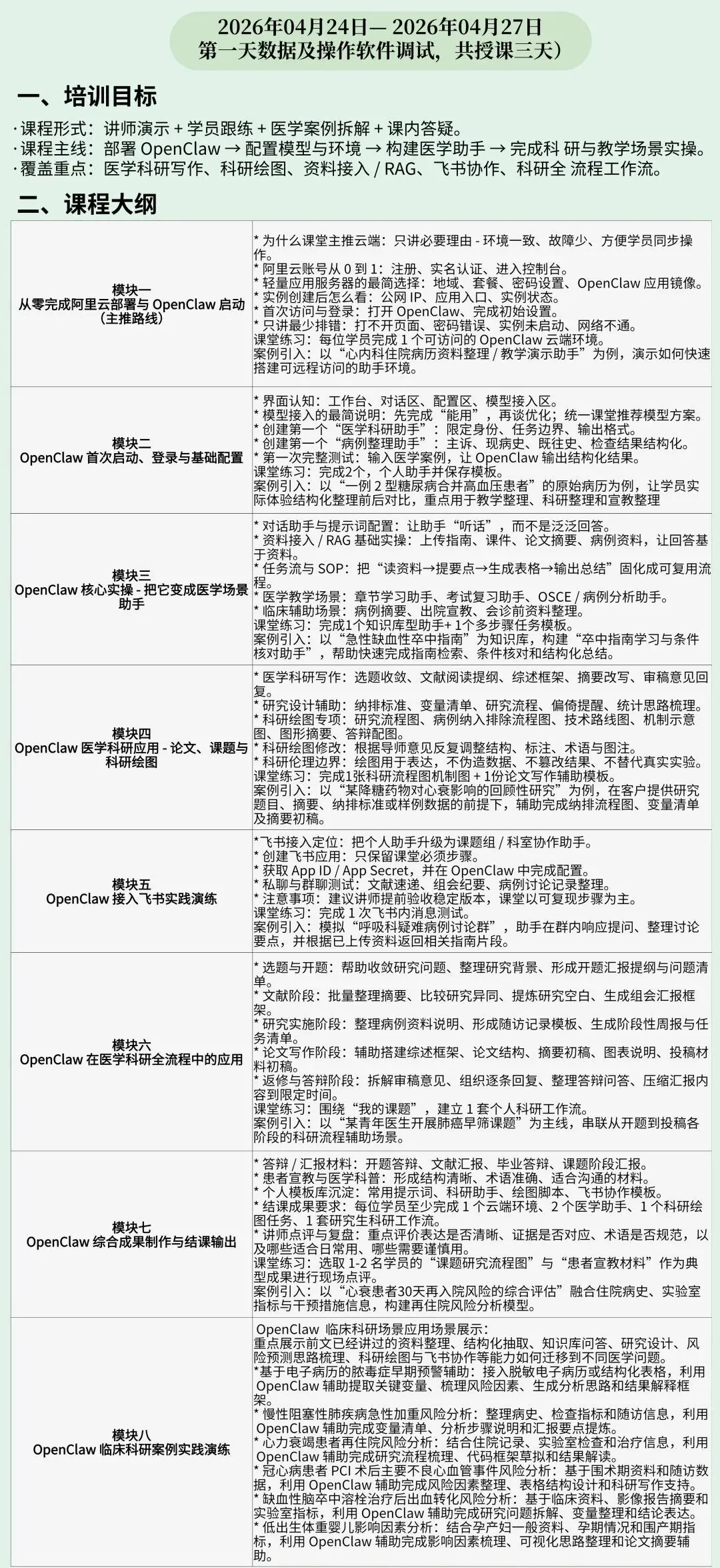 模块八 OpenClaw 临床科研案例实践演练 | OpenClaw 临床科研场景应用场景展示: 重点展示前文已经讲过的资料整理、结构化抽取、知识库问答、研究设计、风险预测思路梳理、科研绘图与飞书协作等能力如何迁移到不同医学问题。 Ø基于电子病历的脓毒症早期预警辅助:接入脱敏电子病历或结构化表格,利用OpenClaw 辅助提取关键变量、梳理风险因素、生成分析思路和结果解释框架。 Ø慢性阻塞性肺疾病急性加重风险分析:整理病史、检查指标和随访信息,利用OpenClaw 辅助完成变量清单、分析步骤说明和汇报要点提炼。 Ø心力衰竭患者再住院风险分析:结合住院记录、实验室检查和治疗信息,利用OpenClaw 辅助完成研究流程梳理、代码框架草拟和结果解读。 Ø冠心病患者PCI 术后主要不良心血管事件风险分析:基于围术期资料和随访数据,利用 OpenClaw 辅助完成风险因素整理、表格结构设计和科研写作支持。 Ø缺血性脑卒中溶栓治疗后出血转化风险分析:基于临床资料、影像报告摘要和实验室指标,利用OpenClaw 辅助完成研究问题拆解、变量整理和结论表达。 Ø低出生体重婴儿影响因素分析:结合孕产妇一般资料、孕期情况和围产期指标,利用OpenClaw 辅助完成影响因素梳理、可视化思路整理和论文摘要辅助。 |