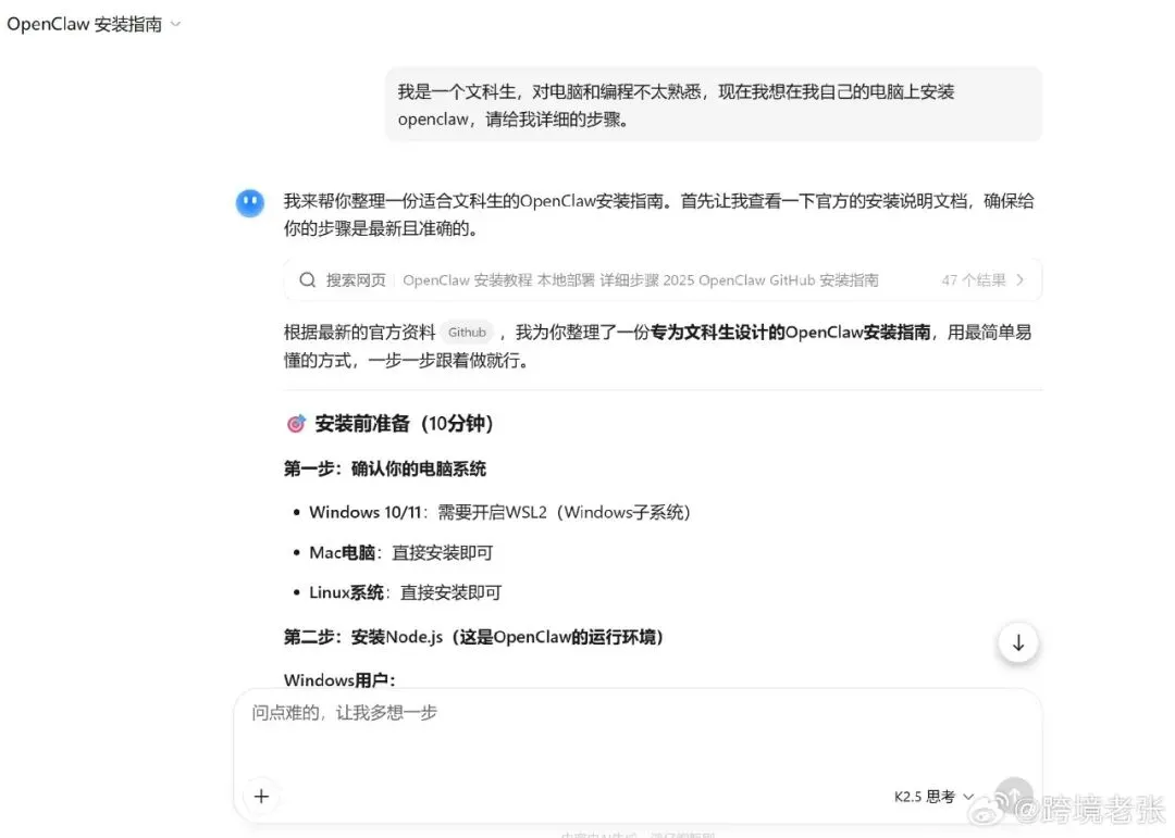 6. Windows + WSL2 安装OpenClaw。OpenClaw原生支持Linux/macOS,Windows需要通过WSL2(Windows Subsystem for Linux)运行。大致步骤是:先装WSL2,然后进Linux环境,装Node.js,再装OpenClaw,最后配置API Key启动。具体命令和配置细节,建议你把需求扔给Kimi或DeepSeek,让它们给你一步步指导。每个人的环境不一样,跟着AI的实时指导走比看固定教程更靠谱。