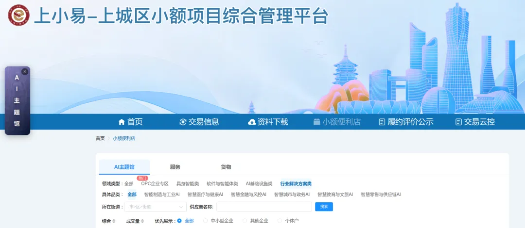 为推动人工智能产品与服务供需对接,上小易平台小额便利店新增“AI主题馆”,专门面向人工智能企业开放,为企业提供独立展示与推广渠道,打造专业化智创空间对接枢纽,实现小额采购精准匹配。
