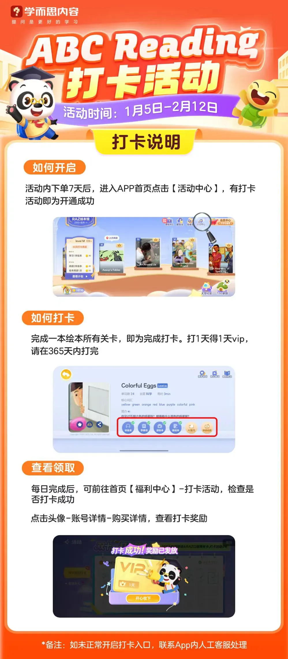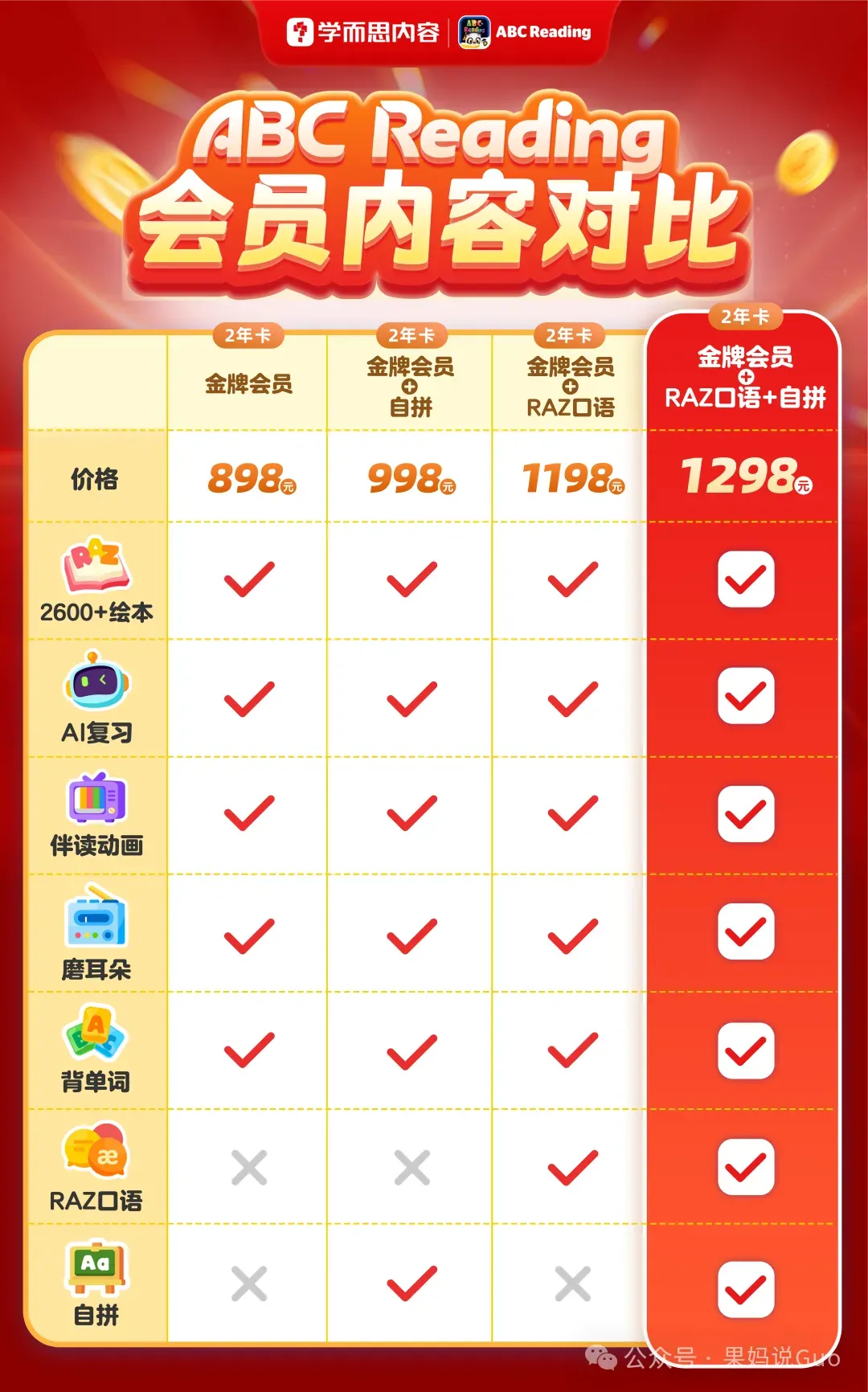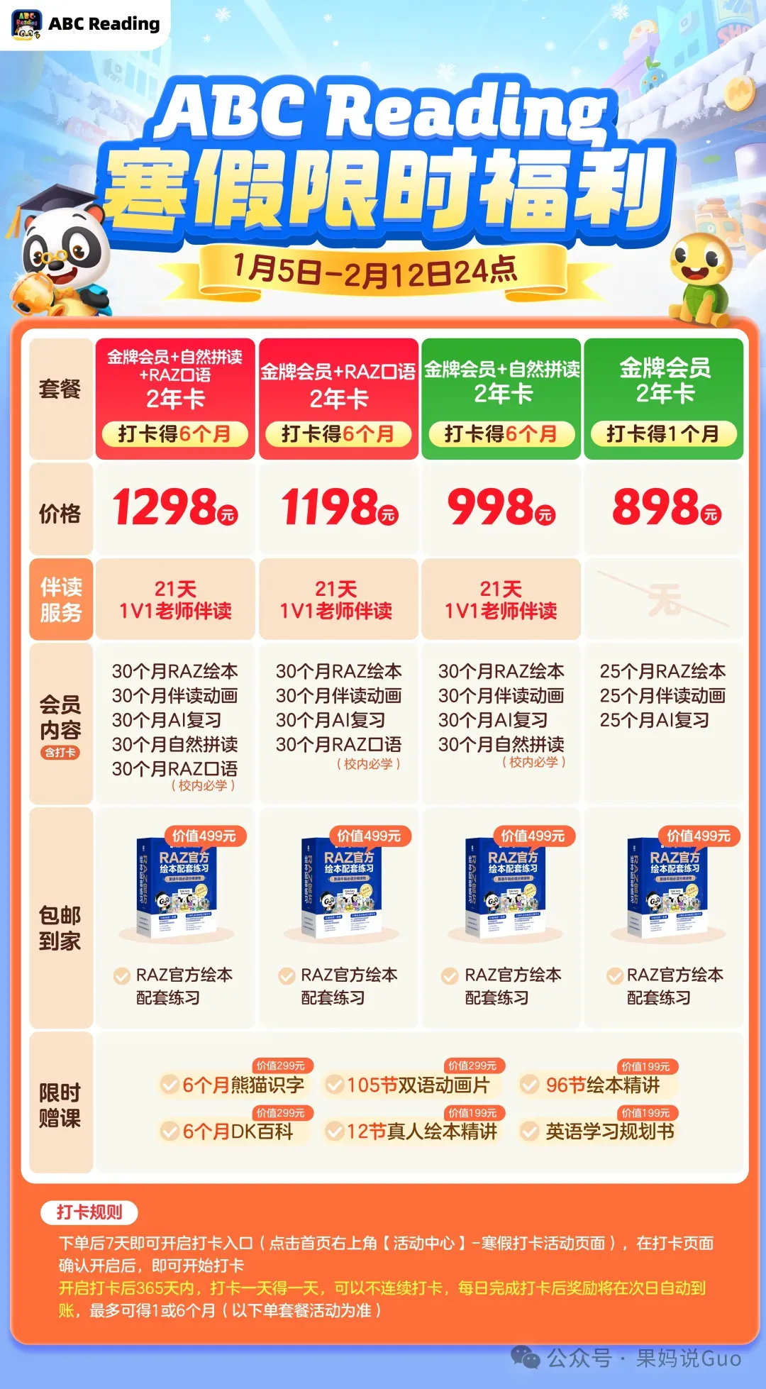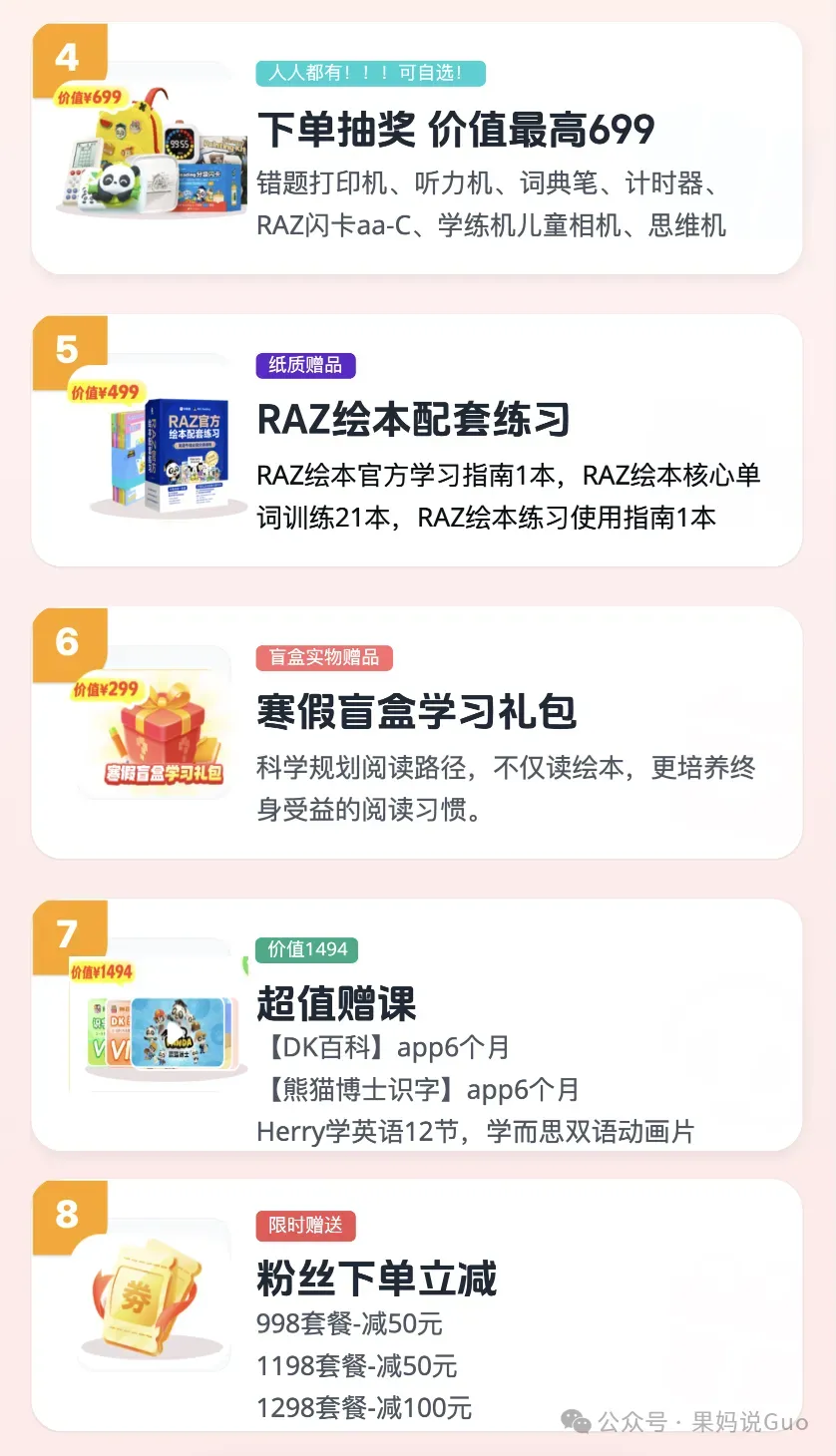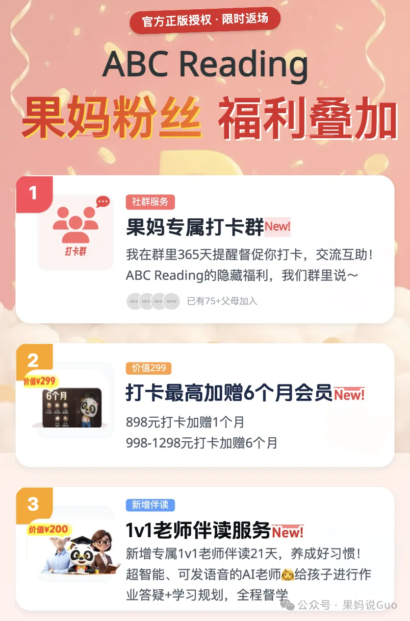 英语大量泛读,这个APP太好用了!最近团购:这大概是我家利用率最高、也是 “战况” 最激烈的家具孩视宝大路灯的清仓活动懂孩子的过刊杂志语文教辅绘本课堂熟悉我的家长都知道,我写过好几次 ABC Reading了。 不是刻意推广,只是在英语启蒙这件事上,它太符合 “刚需” 二字。英语启蒙阶段,需要用大量泛读积累听力词汇,需要在分级里识字,慢慢过渡到自主阅读。到自主阅读阶段,主线成了综合教材,但同时也要搭配大量的泛读和泛听,二者缺一不可。而ABC Reading作为RAZ的线上APP, 它以绘本数量多、词汇量大、过渡平稳、配套资源多狂甩其他APP好几条街,而且APP里除了有RAZ, 它还有其他故事类、中华文化类分级来弥补纯虚构类的干,孩子可以搭配使用。这就是我反复推荐的底气:真刚需,值得反复说。上次的新年活动文,不少朋友跟我说,前面干货看的太投入,看完才发现错过了后面的福利。今天这篇重新发一些ABC Reading 的新年活动,这次的活动整体性价比还是非常高的,有打卡加赠时长,有满减券,也有别人抽奖才送,而我们直接每个人都送的实物锦鲤赠品。 这波高性价比,一定别再错过。我先放链接,然后详细介绍这次的寒假机制。 这次新年的活动到2月12日结束,基本福利如下: 我们同时还有:专属满减券,满998减50元,满1298减100元,直接拍就有!打卡活动,898元打卡加赠1个月,998-1298元打卡加赠6个月各种赠品锦鲤不抽奖,直接送。(可选的有打印机、词典笔、相机、思维机、听力宝等)还送学习盲盒礼包(内含5-10样赠品)我们还建立了打卡群,大家拍下记得联系我进群一起陪伴打卡。我直接用表格把福利给大家快速总结下:是不是比较多?再把赠品和注意事项理一下:✅ 898元打卡加赠1个月✅ 998-1298元打卡加赠6个月,不同价格的这几个套餐有啥区别?核心主要就是有没有自拼,有没有RAZ口语。同时这次打卡可以断,不需要连续打卡,也就是一年内打卡180天就行。✅ 专属满减券,💰满898减50元,💰满1298减100元,大家要留意满减券领取后当天要立刻使用,第二天满减券就失效不能用了。✅ 998-1298元新增专属1v1老师伴读21天,养成好习惯!这一次针对998-1298档位的新用户新增了1v1伴读服务,覆盖AA-G级,通过“人工+AI”相结合的方式交付,老师会用语音+文字手把手教孩子,大家到时候可以试试看。当然,在这个基础之上,我也建立了我们号上自己的RAZ打卡群,不管是规划上、学习细节上的问题,或者是打卡操作不当的问题,或者是坚持的问题,亦或者是ABC Reading的隐藏彩蛋hhh~我们在群里一起沟通前进,更好地推进RAZ的进度。如果大家看完上述套餐,纠结不知道怎么选,那可以直接入手福利机制和功能最齐全的2年卡套餐。〔畅学套餐〕2 年卡 1298 元✔️金牌会员✔️自然拼读✔️Raz 口语它打卡送会员,买2年,最多到手两年半!单月到手价低至 43元,每天不到 1.5 元!绝对的史低价!只有这个套餐,集中了所有的 RAZ 绘本、RAZ 口语、自拼、背单词功能,而且赠品最多,之前靠运气抽奖才能有的“错题打印机、听力机、词典笔、计时器、RAZ闪卡aa-C、学练机、儿童相机、思维机”等等,这次不用靠运气,直接五选一,尤其是之前很多家长都很喜欢的价值 699 元的「思维机」,△摩比思维机(剑桥3合1)还有大全套的价值499元的「Raz 官方绘本配套练习」,这些都是超级硬通货、顶顶值钱的赠品,也都是全网卖爆的学而思王炸产品!△RAZ 官方绘本配套练习ABC Reading 是RAZ的线上版,但里面又不止RAZ绘本,它总共包含了:✅ 超全正版 RAZ 资源RAZ 国内唯一正版授权的线上平台,有2600+绘本超强资源,27个级别的细致划分,不管是0基础还是学过英语的大童,都能找到匹配自己的入手阶段开启长期学习。✅ 经典的四步学习法每一本绘本,按照四步学习法(听--学--读--练)形成一个完整的学习闭环。不知道怎么带孩子泛读的,直接按照它的四步法进行就可以。✅ 超全的配套除了分级阅读,还包含RAZ伴读动画、RAZ自然拼读、RAZ AI复习、RAZ口语,孩子所需要的,在这个APP里都能获得。✅ 其他绘本的横向泛读还有剑桥彩虹分级阅读、中国传统文化绘本、莎士比亚绘本,满足孩子横向补充其他其他类型绘本的需求。下面的学习规划表,是用3年时间从启蒙到自主阅读的规划,给大家参考。到了自主阅读阶段,RAZ 后面的级别就可以纯泛读,一周做几篇Quiz 就行。更详细的攻略,大家参考这一篇:三年通关RAZ, ABC Reading 这样用....今天的文章介绍就到这里,下面是购买链接,直接7天无理由,拍下后记得联系我们进群一起打卡。本文完更多干货阅读: 1. 今天这个热搜,提醒所有父母都关注2. 果果的这份10岁+中文书单,寒假太需要了,每一本都值得反复3. 老师发来英语寒假安排和书单,太及时太重要了,每个孩子都用得上4. 马斯克2026首次访谈,除了说不要读医学院,还说我们给孩子规划的未来,都不存在了!5. 真的要警惕,很多家长假期带娃学英语,都在做无用功6. 五年级家长会,听数学老师讲数学,我出了一身冷汗...7. 从启蒙到进阶,这份历史启蒙路线强的可怕