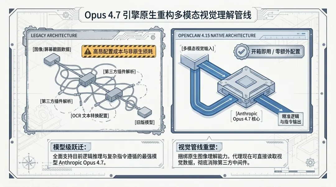 本次更新最直观的变化是对 Anthropic Opus 4.7 模型的支持。作为当前第一梯队的模型,Opus 4.7 在复杂指令遵循和逻辑推理上的表现有目共睹。更重要的是,该支持原生集成了图像理解能力。这意味着在处理屏幕截图分析、OCR 数据提取等视觉任务时,无需额外的中间件配置,Agent 即可直接闭环处理。