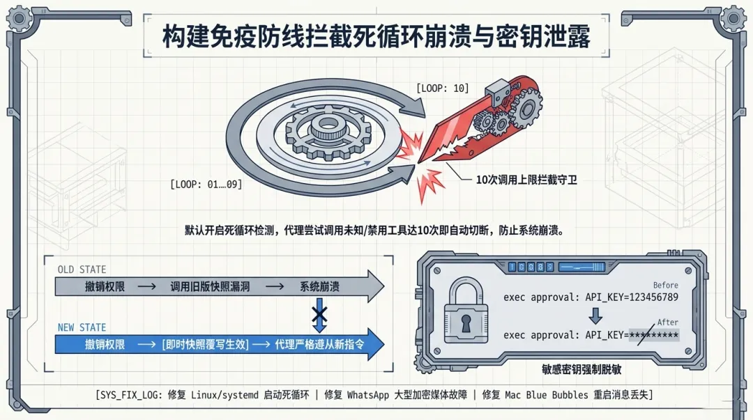 工具循环检测守卫:这是一个关键的安全补丁。当工具被禁用或不可用时,新的守卫机制会在代理尝试调用约 10 次后自动拦截,防止死循环导致的资源耗尽。