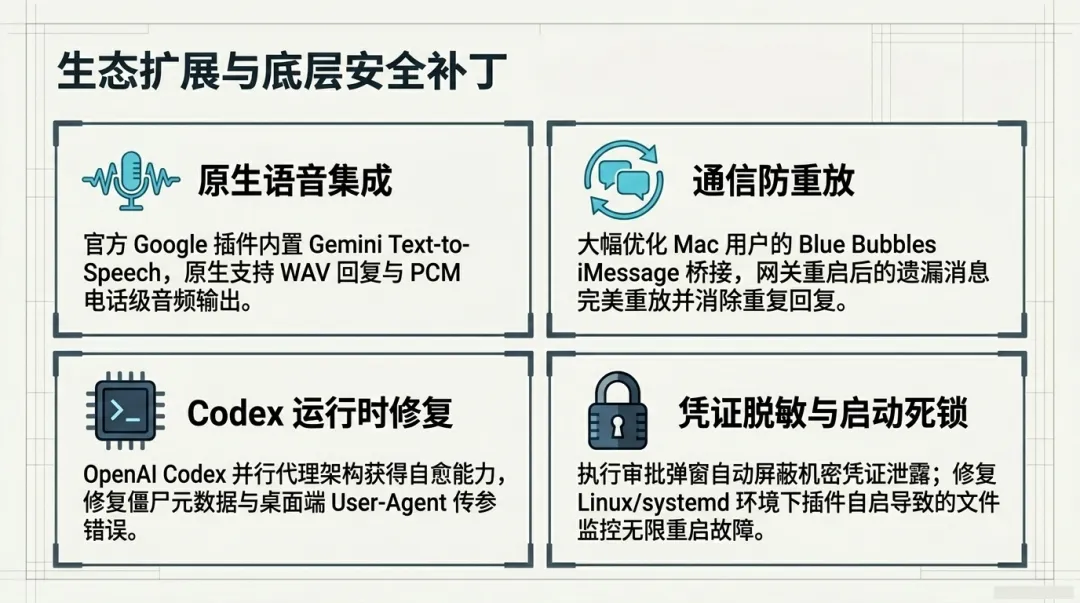 技能快照即时生效与密钥脱敏:修复了技能变更后旧快照仍生效的漏洞,并在审批提示中对敏感凭据进行了脱敏处理,进一步提升了企业级应用的安全性。