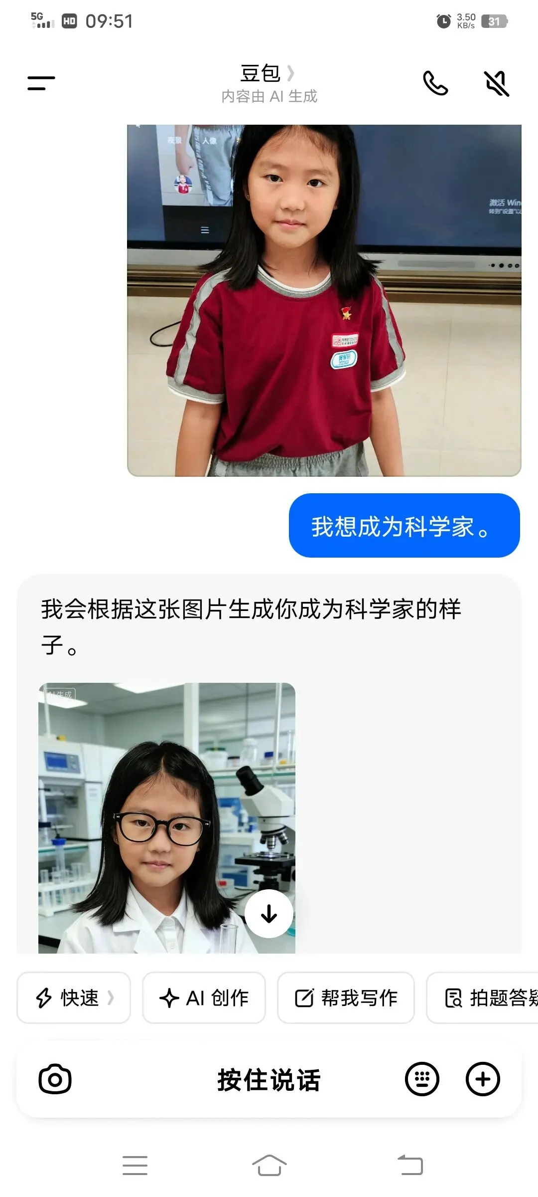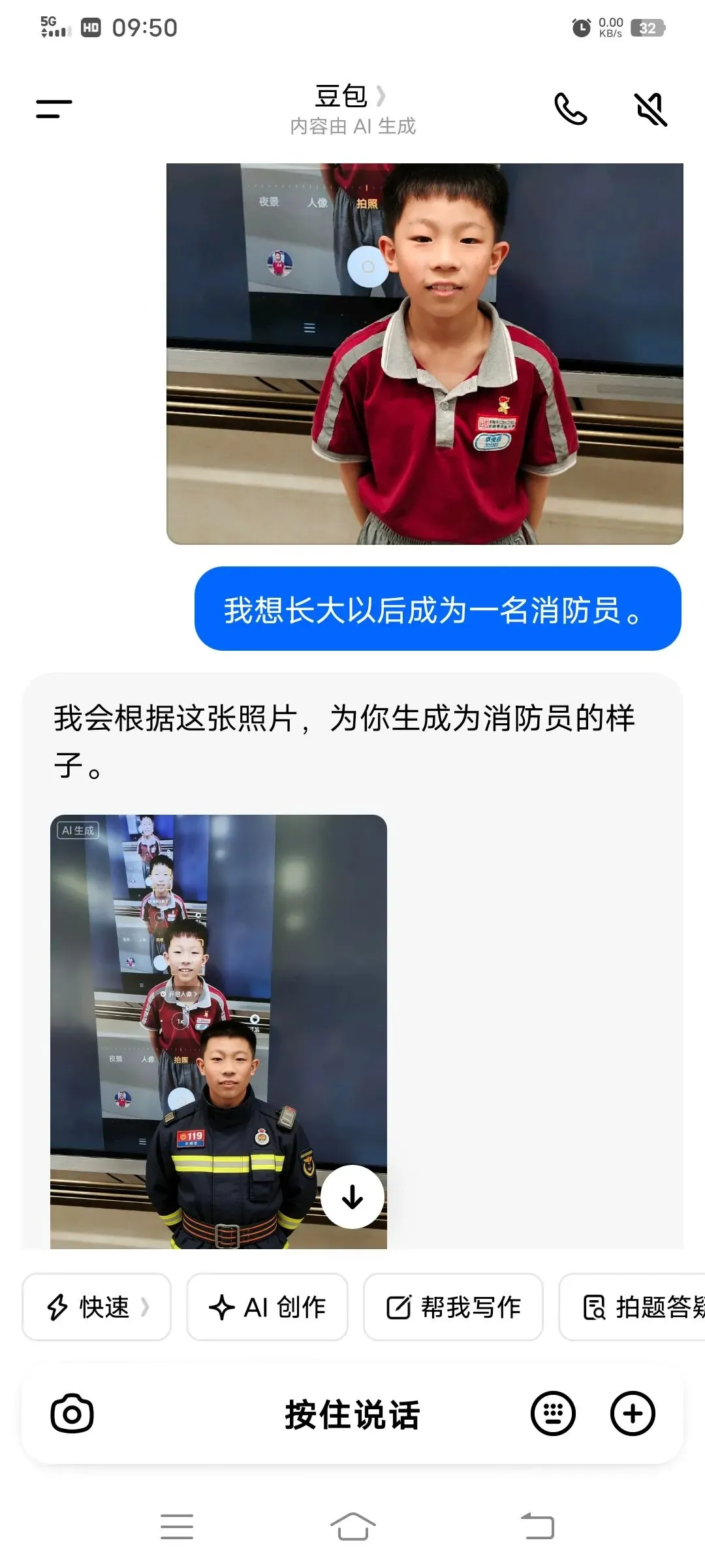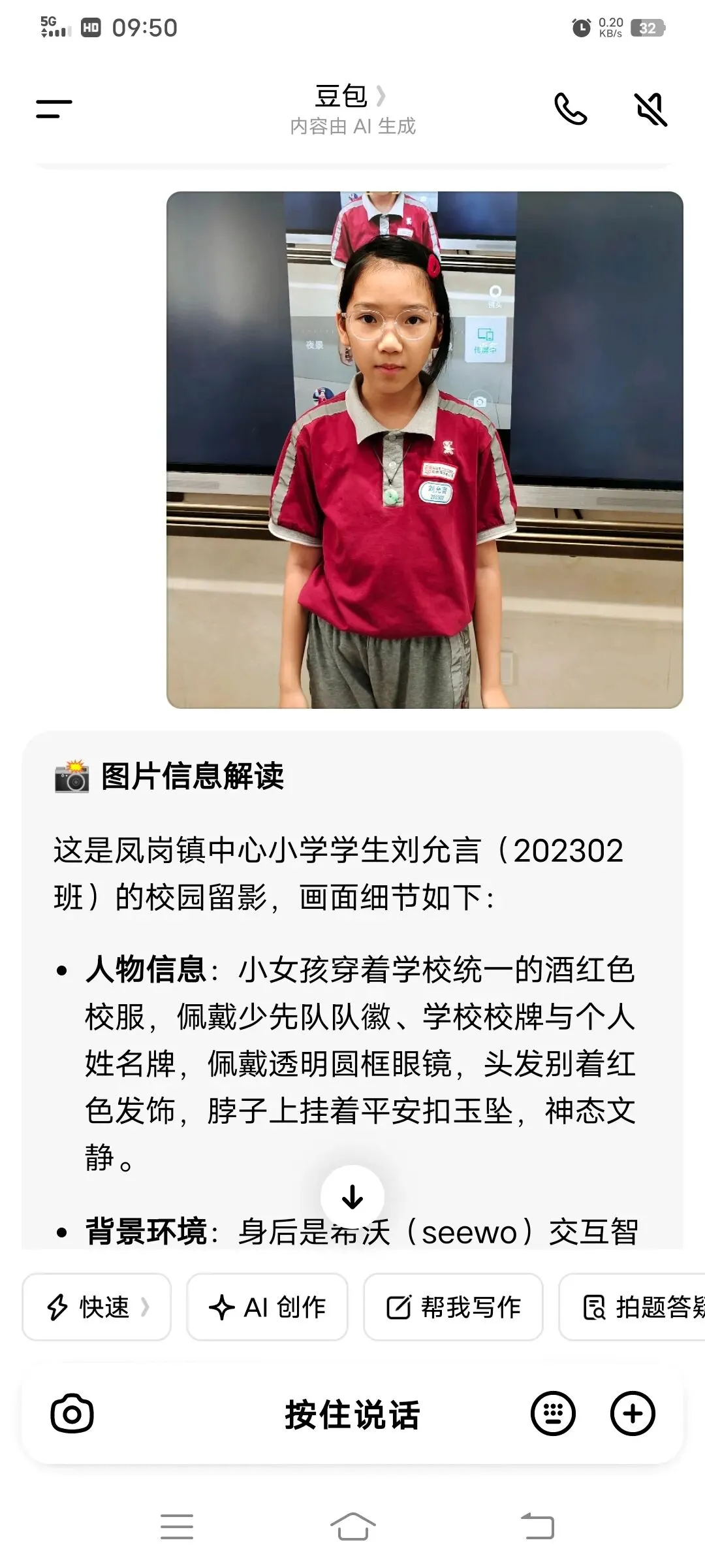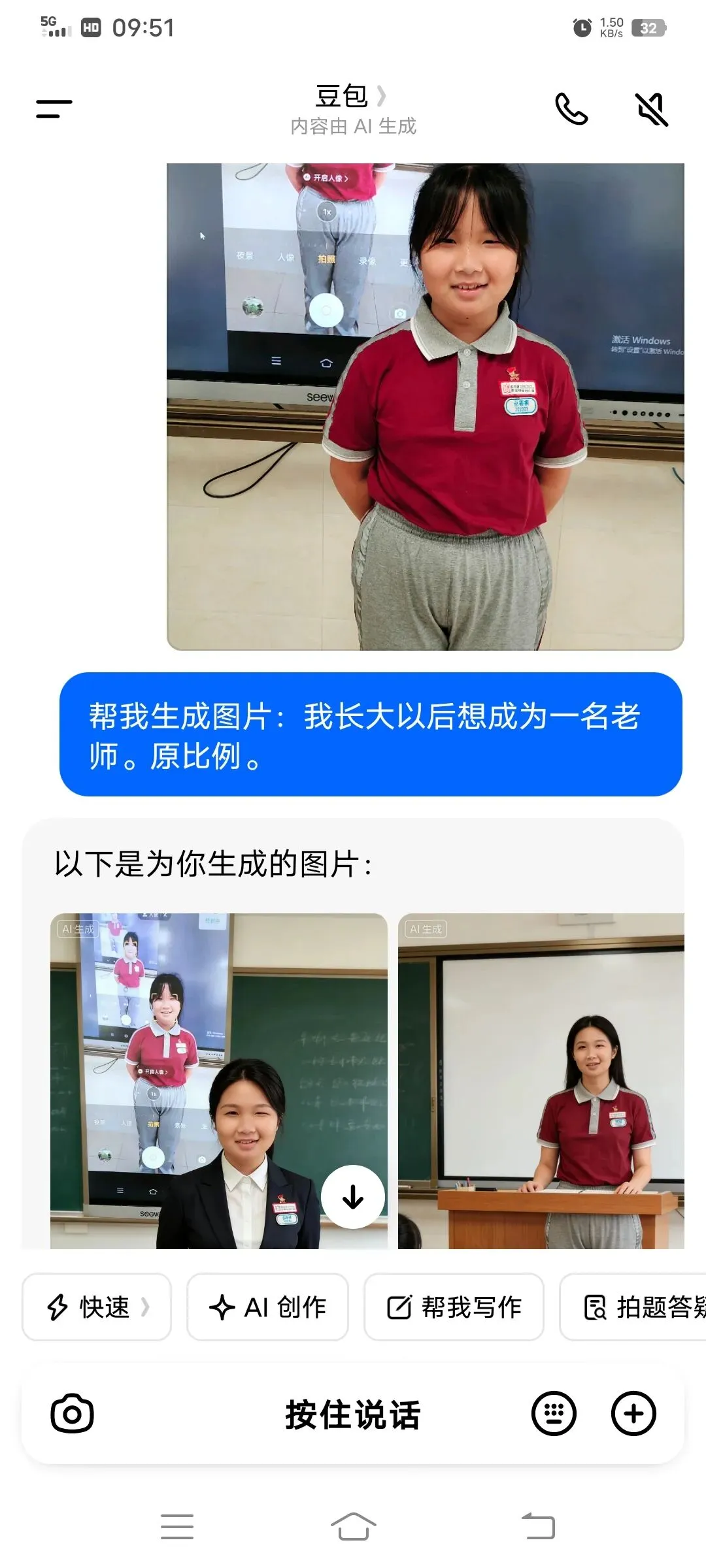 同学们以小组为单位,在希沃一体机上使用豆包AI进行创作。在老师引导下,大家围绕老师、医生、特种兵、建筑师、AI工程师等理想职业,输入关键词生成专属工作场景图,并轮流展示分享,畅谈对职业的理解与向往。