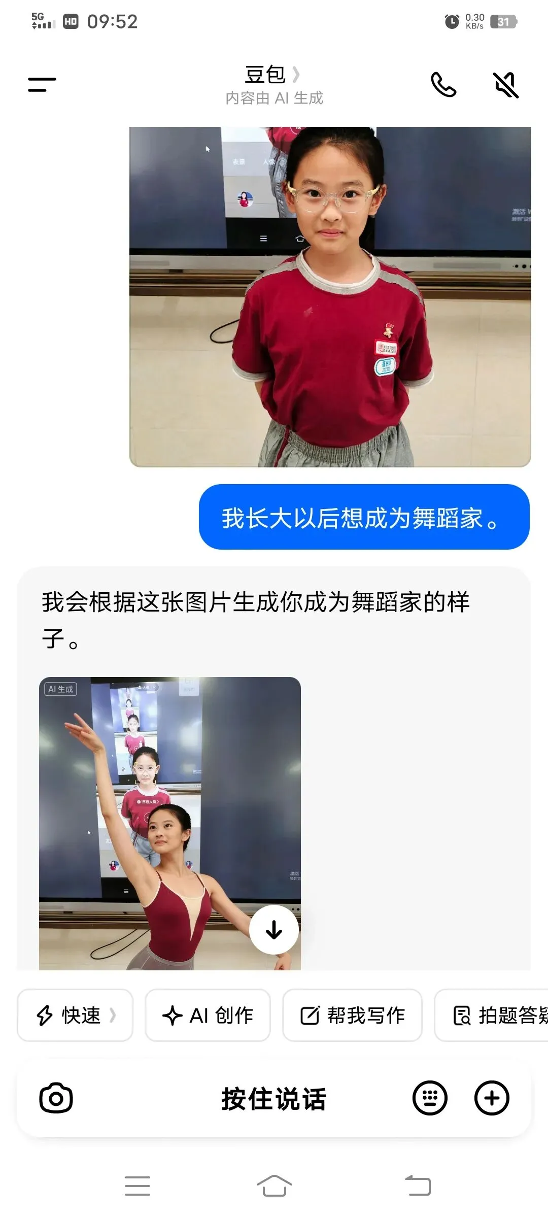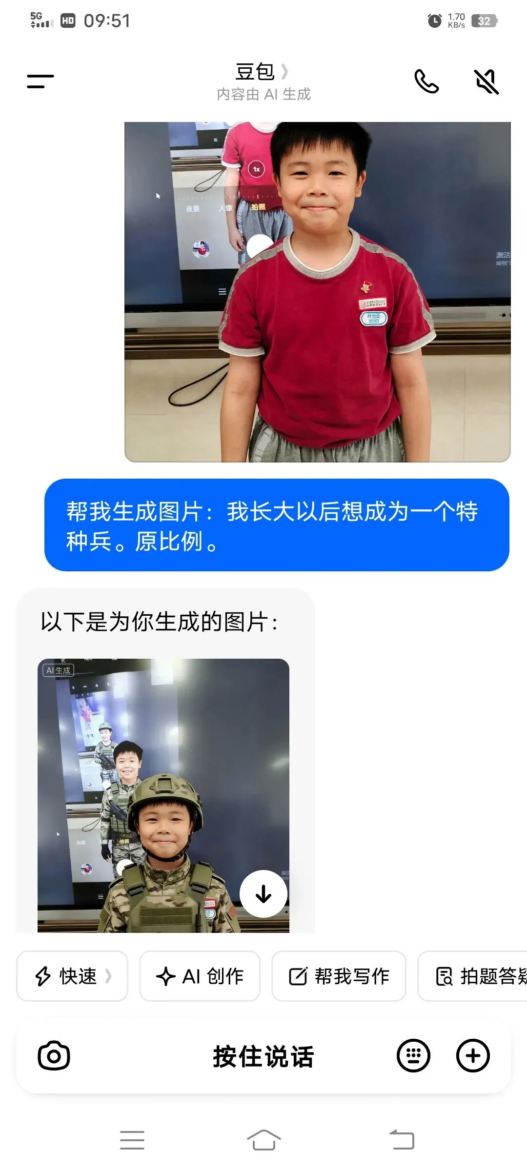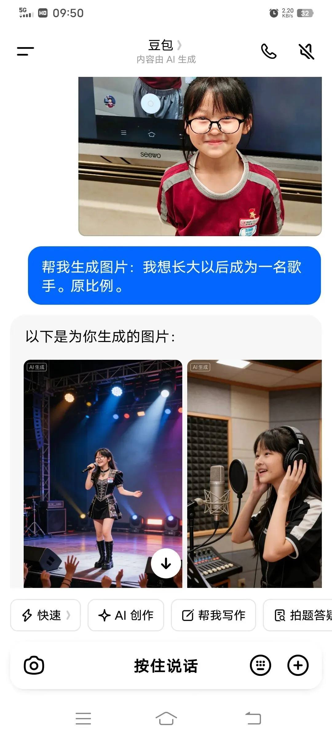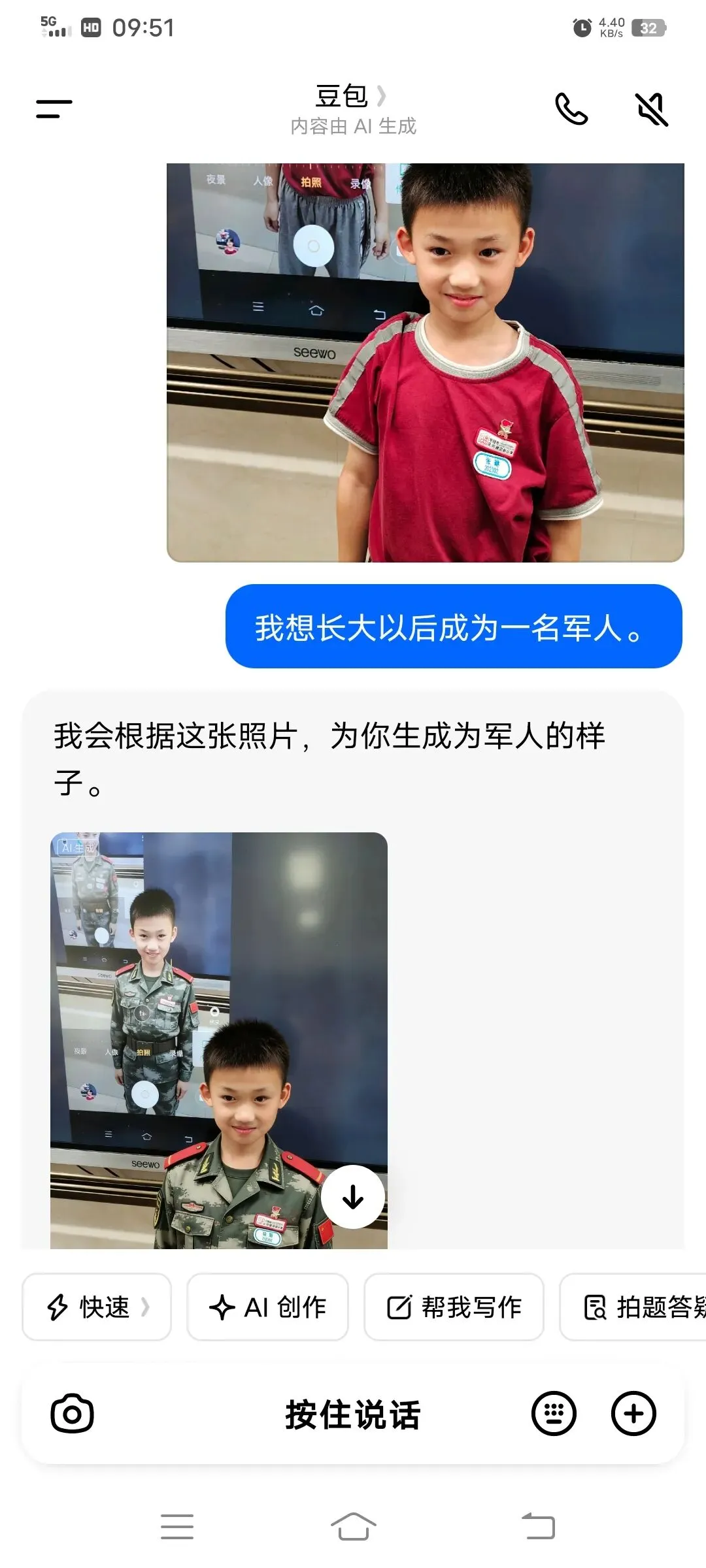 同学们以小组为单位,在希沃一体机上使用豆包AI进行创作。在老师引导下,大家围绕老师、医生、特种兵、建筑师、AI工程师等理想职业,输入关键词生成专属工作场景图,并轮流展示分享,畅谈对职业的理解与向往。