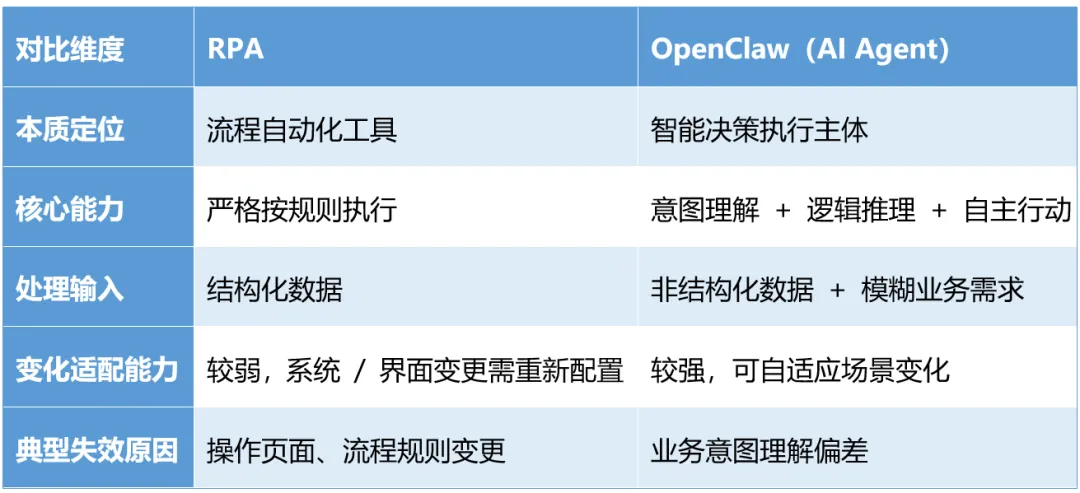用最通俗的话总结:RPA=不带大脑、严格按步骤执行的“自动化机器人”;OpenClaw=会理解、能推理、可自主行动的“AI智能员工”为了更直观区分,我们从核心维度做对比: