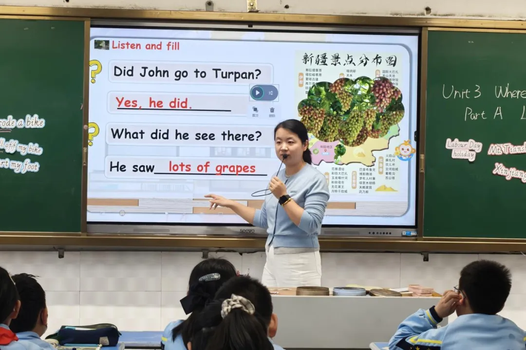 在新知呈现环节,罗老师充分利用AI多媒体资源,展示高清新疆景点分布图和吐鲁番葡萄实景图,配合“Listen and fill”智能听力练习,引导学生理解对话内容。学生通过可视化界面直观感受天山、吐鲁番的自然风光,在真实语境中掌握“rode a horse”“went camping”等核心短语,实现了语言学习与文化意识的有机融合。