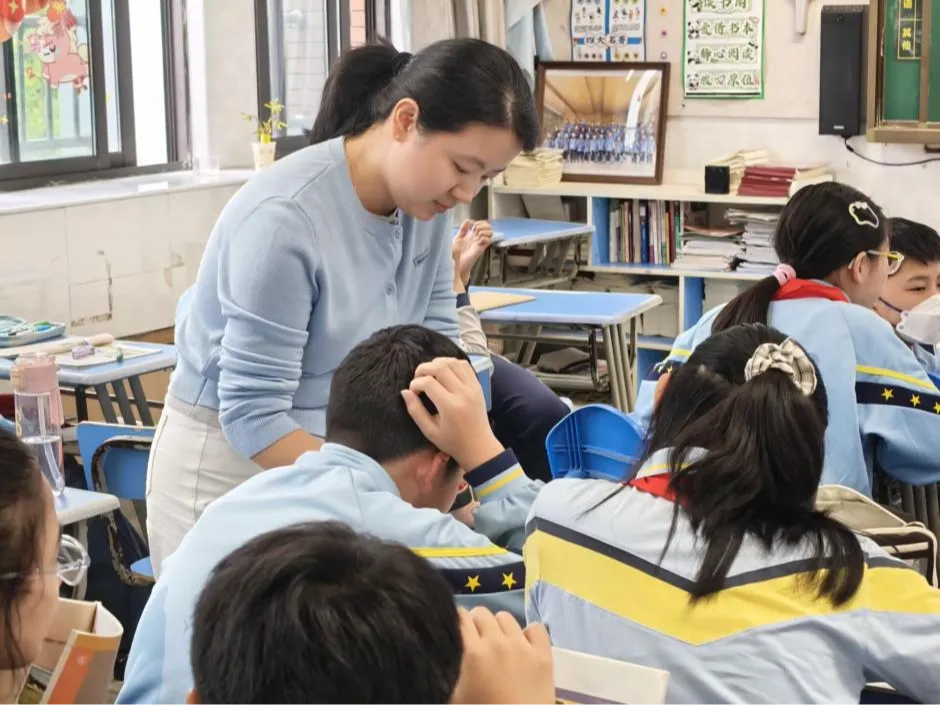 课堂中,罗老师借助AI学习数据分析,精准把握学情,开展分层教学。在小组合作环节,她深入学生中间进行个性化指导,针对不同水平学生提供差异化支持——为基础薄弱学生提供句型框架,鼓励学有余力的学生拓展表达。AI技术赋能下的精准教学,让每位学生都能在原有基础上获得提升。