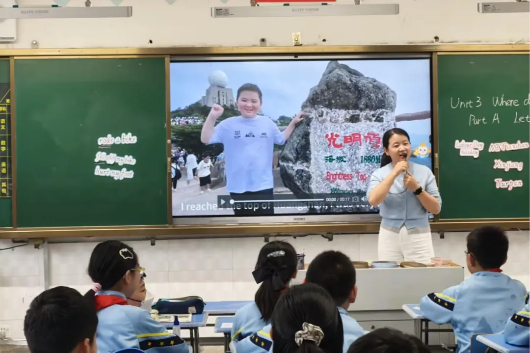 在拓展运用环节,罗老师播放学生运用AI工具制作的假期旅行视频,展示学生登顶黄山的精彩瞬间。这种“AI+学生作品”的展示方式,既巩固了本课语言知识,又激发了学生的创作热情,体现了“做中学”的教学理念。
