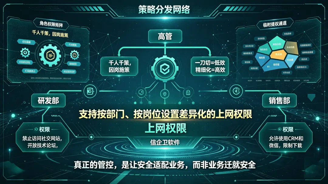 支持按部门、按岗位设置差异化的上网权限,研发人员可以访问的域名范围,和销售人员完全不同。带宽使用监控能识别出哪些终端在消耗大量流量,异常流量行为(大量数据往外发)可以触发告警,从网络层面提前发现潜在泄露动作。