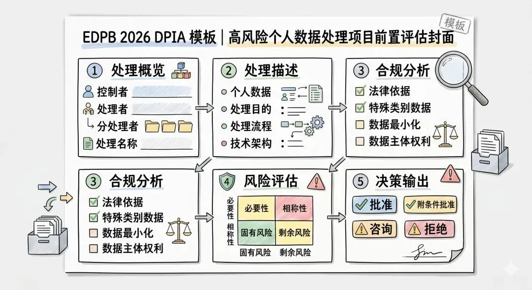 欧洲数据保护委员会于 2026 年 3 月通过新版《数据保护影响评估(DPIA)模板》。这份文件不是原则性概述,而是一套可直接用于高风险处理项目的评估框架,覆盖处理描述、法律依据、最小化、数据主体权利、风险评估、缓解措施和最终决策。本文提供全文翻译,并附企业合规视角下的使用提示。