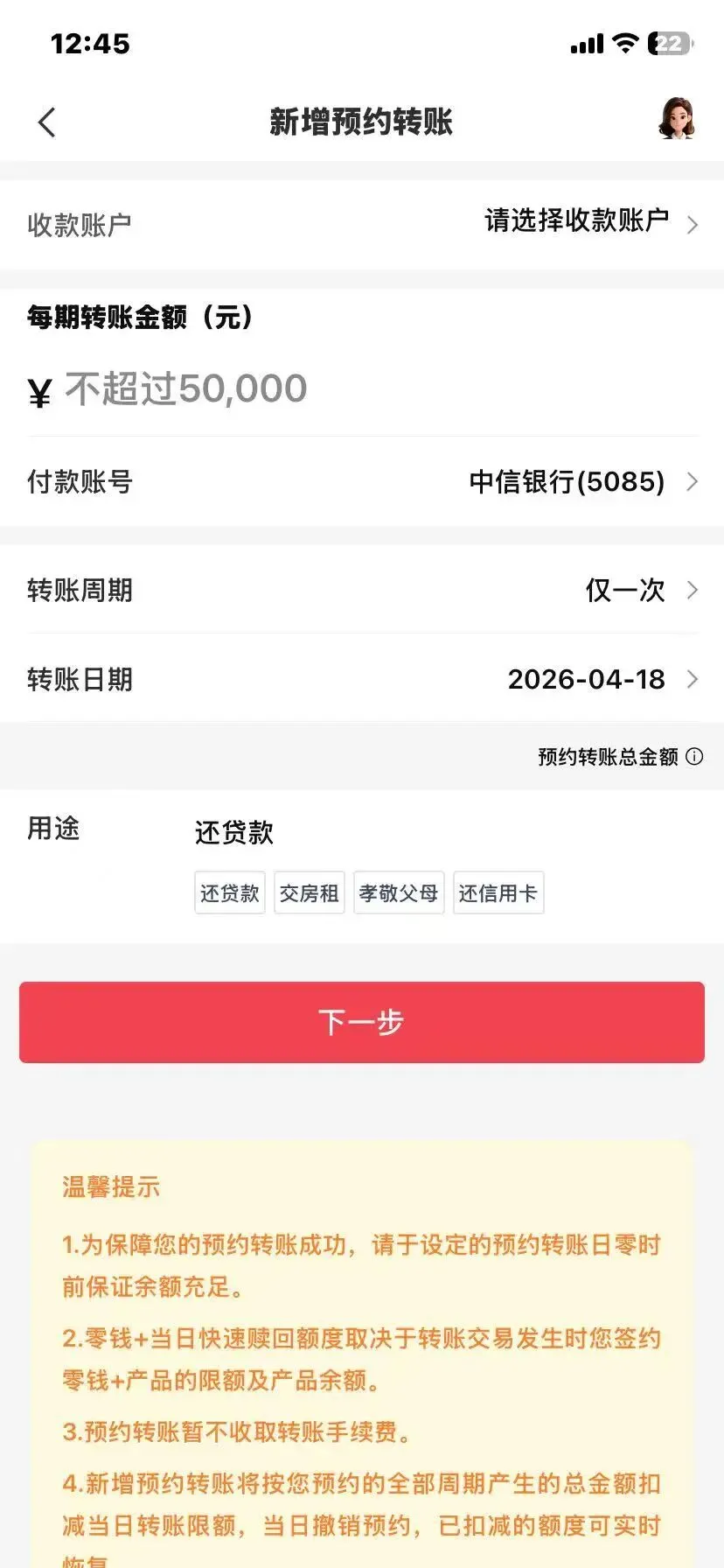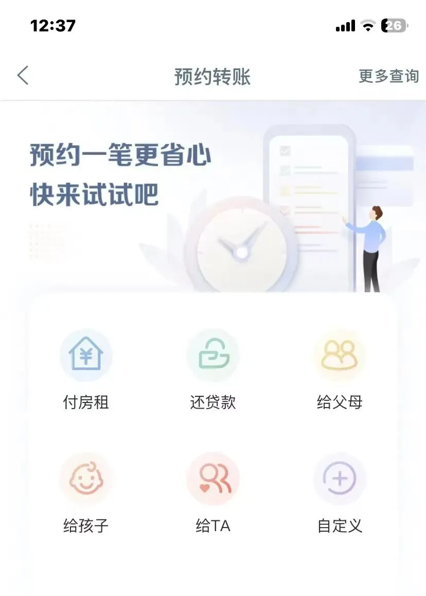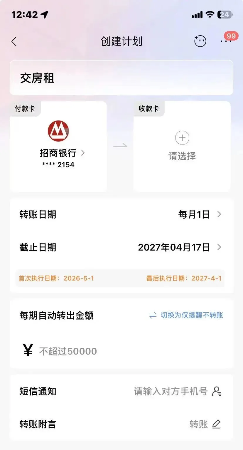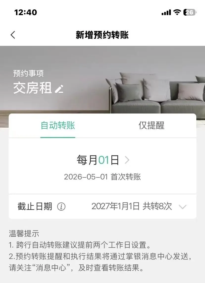 懒人自动存钱模板中银行自动转账设置方法首先,自动转存实际上就是 手机银行里的自动转账,一般打开手机银行APP后,进入转账功能,这个功能很醒目,很容易找。进入转账功能界面,找到【预约转账】功能,大多数手机银行里都叫预约转账,这个我亲测过。进入预约转账,选择每月转出日期、收款账号等等信息,有的还可以选截止日期(就是【自动转账】生效后,到哪一天结束)。这样就设置好了,可以选择用途,还房贷、交房租、给父母、存钱、理财等等,可自定义设置。 这个用途有的是进入预约转账界面就可选择,有的是填写转账信息时候可以选择的。大体看一下就明白了,页面比较简单。选择预约转账,进入预约转账页面,选择转账的用途,如交房租。比如 设置 存钱 理财 零花钱 等,然后各自进去设置转账的信息。进入预约转账页面,选择场景,可以自定义,和工行的一样。每个银行可能会有不同,功能基本差不多。比如,进入交房租场景,则继续设置转账时间、截止日期等。设置好按提示下一步,设置转账信息。就这么一步一步来,很简单。进入预约转账页面,如果没设置过,则点下面的 加号。就是下面红色圆圈里的加号。点击 加号,出现各种场景:交房租、还贷款等,和工行 农行 一样。可以自定义。然后一步一步进行设置。设置转账信息,付款卡 收款卡 转行时间 截止日期 金额等,按步骤一步一步,就OK了 。点击界面下方 新增预约转账,这个和招商的那个加号一样。设置转账信息,最后写上【用途】,其实就是使用场景。这几个例子应该可以代表大多数手机银行的设置了,总之,就是转账页面里的【预约转账】功能,按步骤一步一步设置即可。如果有问题可以留言。感谢大家的关注。