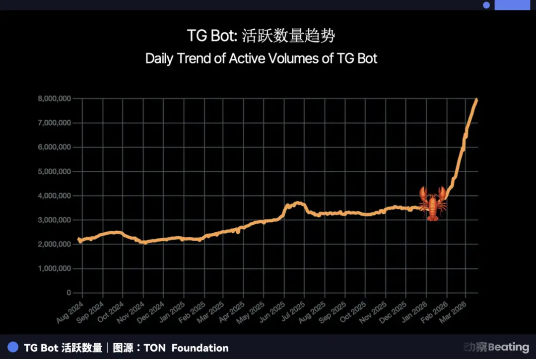 2026 年初,Telegram 上的活跃 Bot 数量在短短几周内,从约 300 万猛增至 800 万以上。要知道,那最初的 300 万,是 Telegram 自 2015 年推出 Bot 生态后,用近十年的岁月才缓慢攒下的家底。