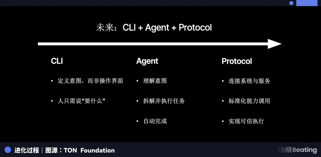 CLI 负责承接用户意图,用户不再操作复杂图形交互界面,而是直接用自然语言提出需求;Agent 负责理解意图、拆解任务并完成执行;Protocol 则进一步连接服务、资金与权限,让 Agent 不只是「会聊天」,而是真正具备与外部世界交互和完成可信执行的能力。Telegram 这套生态的特别之处,在于它正在把这三层逐步拼接成一个完整体系。