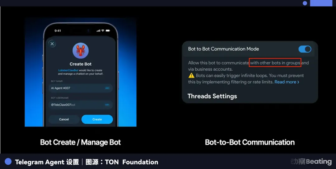 但在这三层结构里,有一个细节尤其值得单独拎出来,Telegram 最新推出了几个功能,现在 Bot 已经可以创建和管理其他 Bot,Bot 与 Bot 之间也可以对话交互。这更像是一个物种进化的信号。过去所有的 Agent,本质上都是「单细胞生物」,只能响应人类的指令,完成人类交代的单一任务。