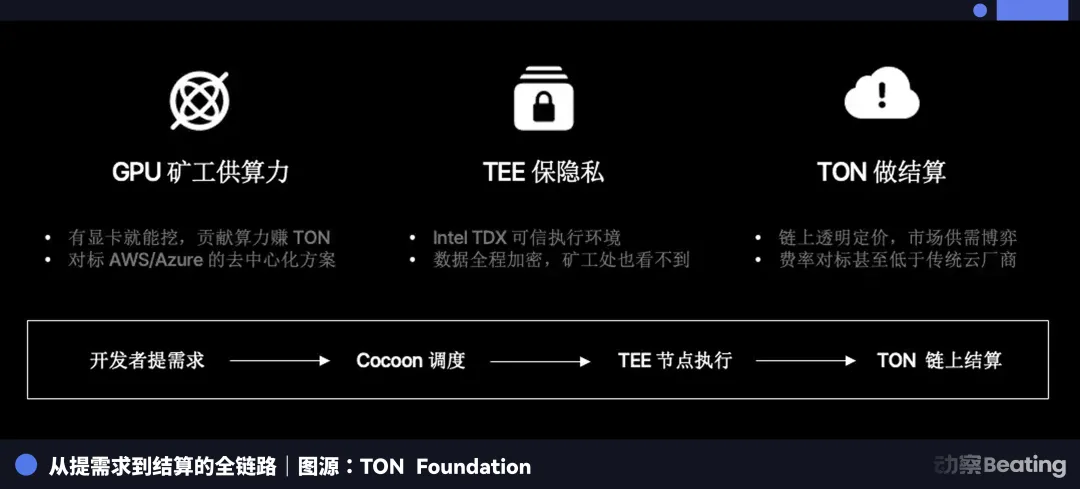 于是 Telegram 推出了 Cocoon,以此来为 Agent 补上一具坚实的「肉身」。Cocoon 的全称是 Confidential Compute Open Network,是一个去中心化的 AI 推理算力调度和交易网络,由 分散全球的 GPU 节点运营者提供算力,Agent 开发者和用户消费算力,通过 TON 区块链完成支付结算。