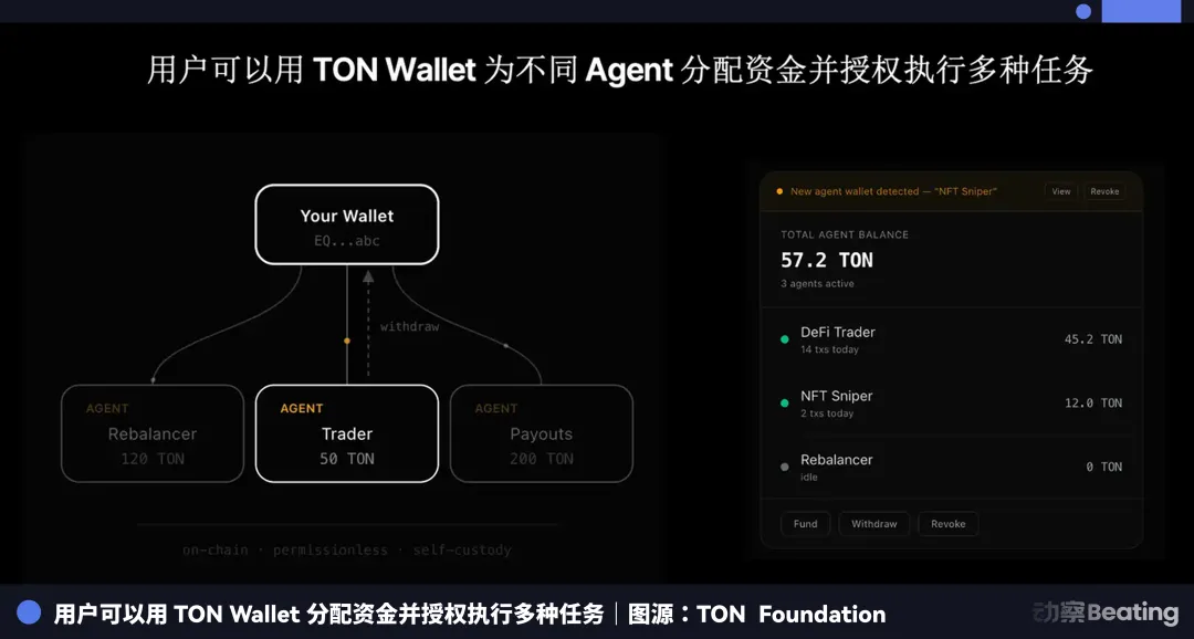 一个 Agent,得先弄明白自己究竟是谁,以及是否真的拿到了替主人出面行事的许可。在 TON 的体系中,这一部分首先由 Telegram 内置的 TON Wallet 承接,用户通过 TON Wallet 钱包完成身份确认与授权,Agent 才可以在明确权限下执行操作,而不是停留在对话层。