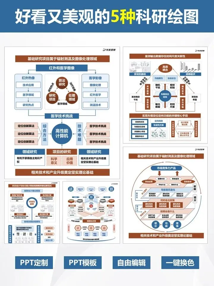 还在为科研绘图抓耳挠腮?这组高颜值科研绘图模板覆盖辐射测温、车载定位、故障分析、状态估计、工程监测五大核心领域,逻辑严密、版式专业,精准适配学术论文与项目申报全场景!从技术路线、研究框架到机制流程图,每款模板都采用层级分明的可视化设计,棕蓝高级配色契合学术审美,支持自由编辑、一键换色,无需熬夜作图,直接填充内容即可产出高质量可视化成果,帮你高效提升论文质感与汇报表现力,轻松拿捏学术可视化!PPT制作及科研绘图相关服务,请联系周老师18701118732(微信)