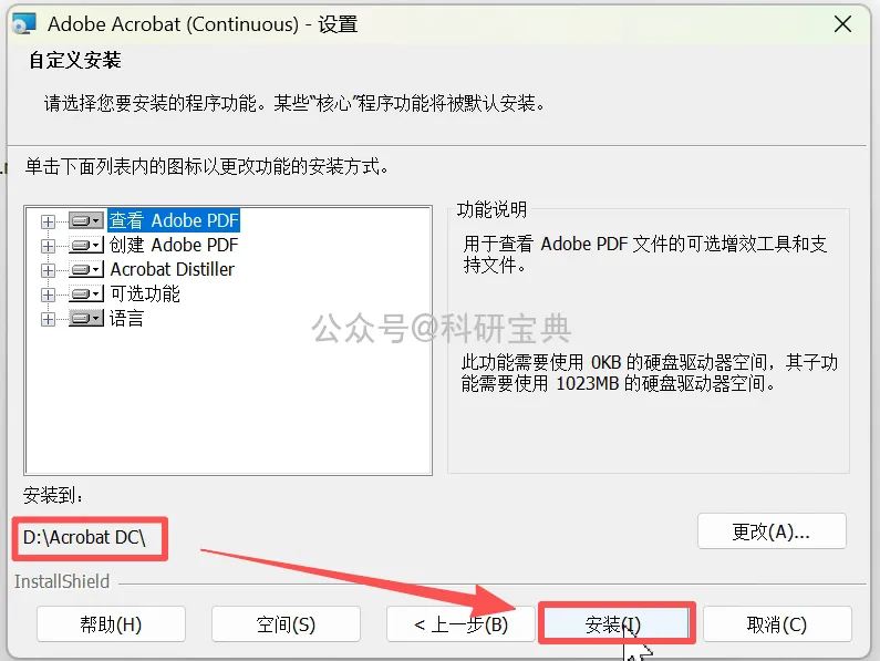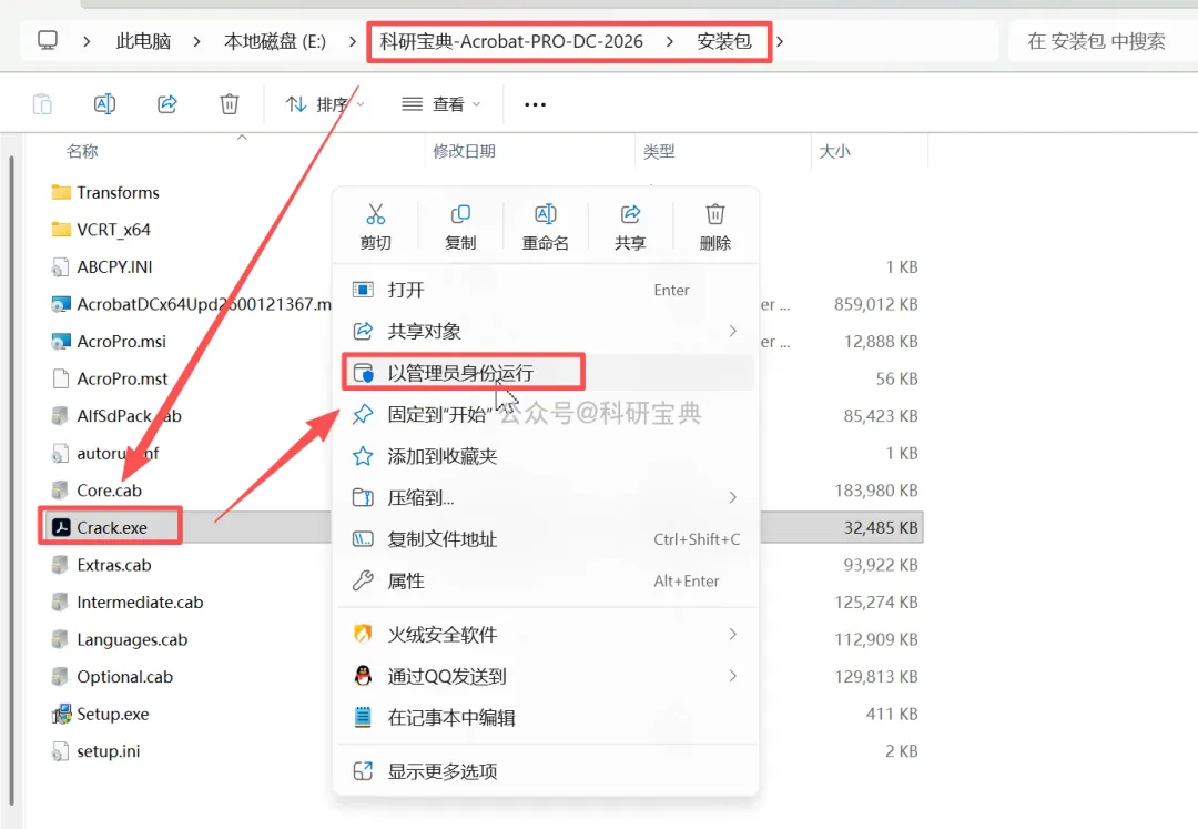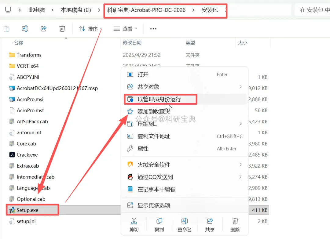 1、下载压缩包【科研宝典-Acrobat-PRO-DC-2026】至电脑本地,并解压(我们压缩时候没有设置密码,如果解压时候需要密码,请换一个解压软件),得到如下文件;选择【Setup.exe】,【右键】-【以管理员身份运行】;