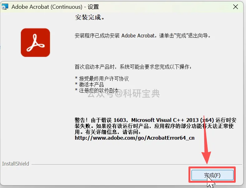5、安装完成,点击【完成】(下面的警告可忽略);