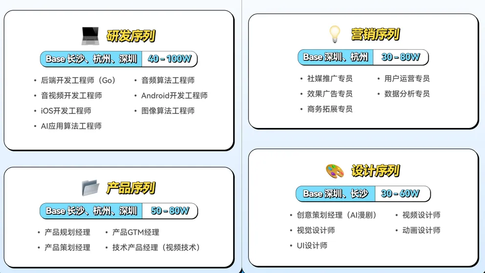本次招聘开放研发、产品、营销、设计四大类岗位,工作地点覆盖长沙、深圳、杭州等多地。