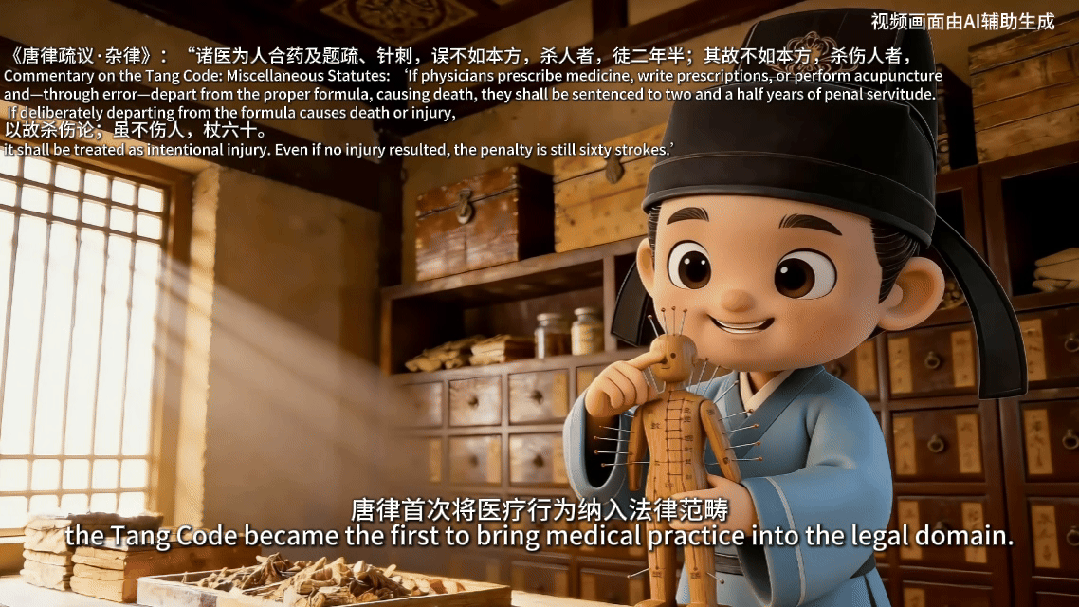 在针灸、草药技术的发展推动下,唐律首次将医疗行为纳入法律范畴。比如《唐律疏议·杂律》有规定:“诸医为人合药及题疏、针刺,误不如本方,杀人者,徒二年半;其故不如本方,杀伤人者,以故杀伤论;虽不伤人,杖六十。”