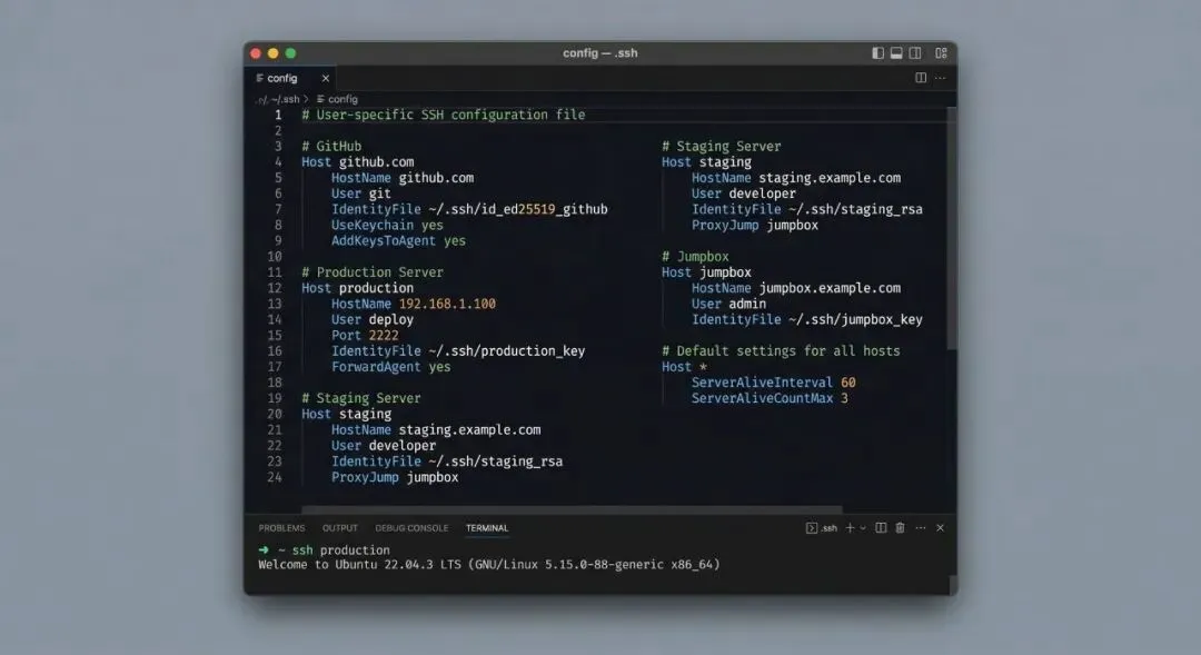 推荐把常用参数直接写进 ~/.ssh/config,这样后面隧道和常驻会稳定很多。