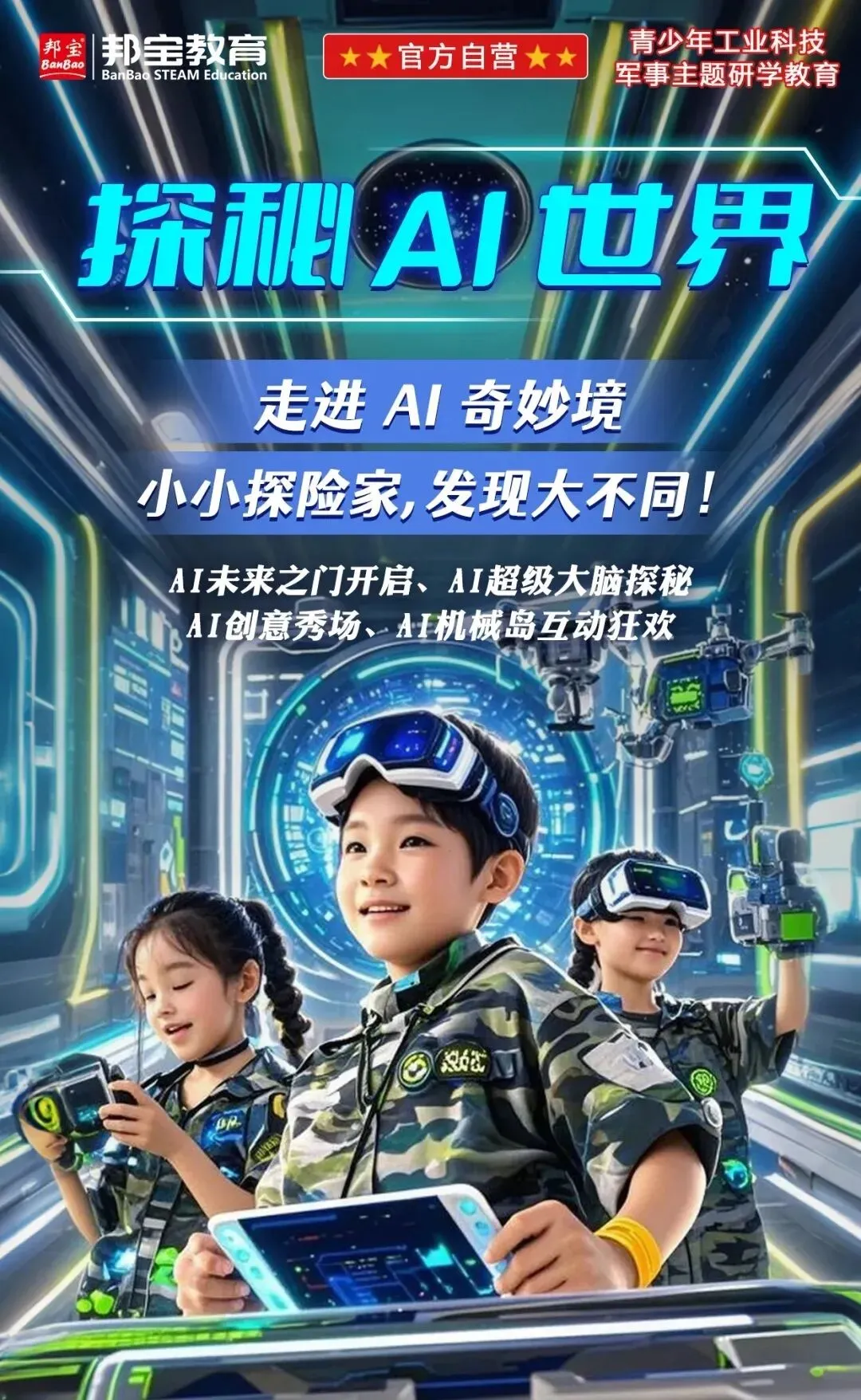 当AI与未来相遇,探索便有了无限可能。邦宝科创园用一场充满未来感的科技研学,打开通往智能世界的大门—从AI创意秀到海洋主题交互,从机械岛机器人狂欢到趣味科技拓展,让每一次互动都成为思维的碰撞,让好奇心在智能体验中尽情生长。