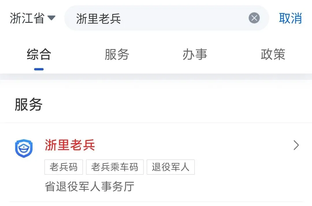 (3) 在搜索栏输入“浙里老兵”,选择【浙里老兵】