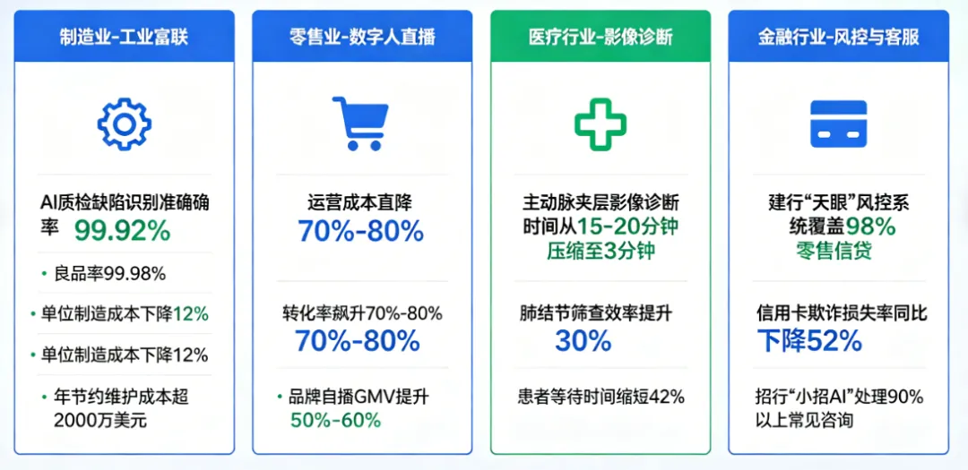 制造业:工业富联AI质检,缺陷识别准确率达99.92%,良品率逼近99.98%,单位制造成本下降12%,年节约维护成本超2000万美元¹;
