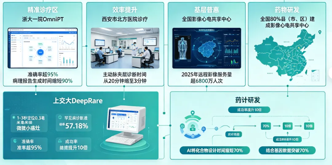 精准诊疗:浙大一院OmniPT系统,1-3秒定位0.3毫米微小癌灶,准确率超95%,病理报告生成时间缩短90%¹³;上交大DeepRare系统,仅凭症状首次诊断罕见病准确率达57.18%,结合基因数据突破70%¹³;