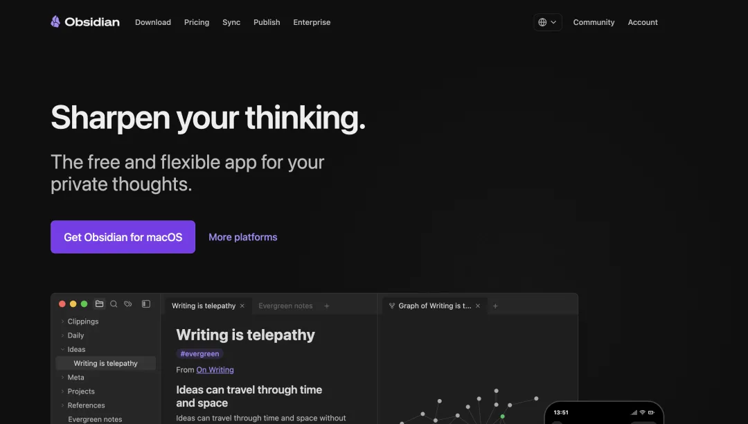 第四个最近被高频提及的产品,是 Obsidian。它和 Notion 一样,都属于笔记和知识管理大赛道里的产品,但它吸引的用户群体,明显更偏向知识生产者、深度写作者以及技术圈用户。