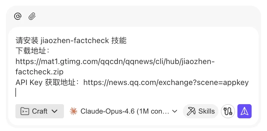 完整复制下方框内文字,发给你的龙虾(Agent)以部署 jiaozhen-factcheck skill。