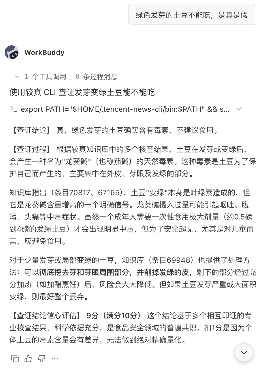 只需向你的龙虾提问,例如“绿色发芽的土豆不能吃,是真是假”、“网传大爷徒手接下坠楼小孩视频,是真的吗?”,龙虾就会自动调用 jiaozhen-factcheck skill 进行查证。不但告诉你查证结论、查证过程,还贴心给出“查证结论信心评估分数”,结论更可信。