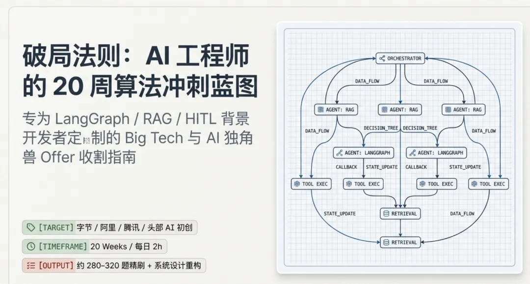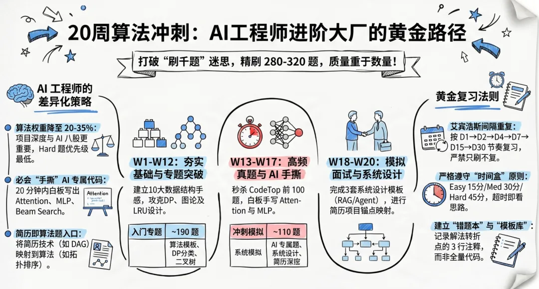 核心结论先行(BLUF):20 周 / 约 280–320 题是冲刺字节/阿里/腾讯/美团/AI 初创的合理路径——不是 500 题、不是 1000 题。质量远胜数量:CodeTop Top 100 + LeetCode Hot 100 + 剑指 Offer 非重复题,总量 ~180 道是覆盖国内大厂 80% 面试题的最短路径;额外 100 道做 DP/图/设计专题强化,即可覆盖到 95%。对 LangGraph + RAG + HITL 背景的 AI 工程师,算法只占 AI 初创面试 20–35% 权重(显著低于纯后端的 40–50%),因此 Hard 题优先级最低;真正拉分项是:手撕 Attention/MLP/Beam Search(MiniMax 准标配)、系统设计三件套(RAG / Multi-Agent / LLM Serving)、简历项目到算法题的锚点映射。