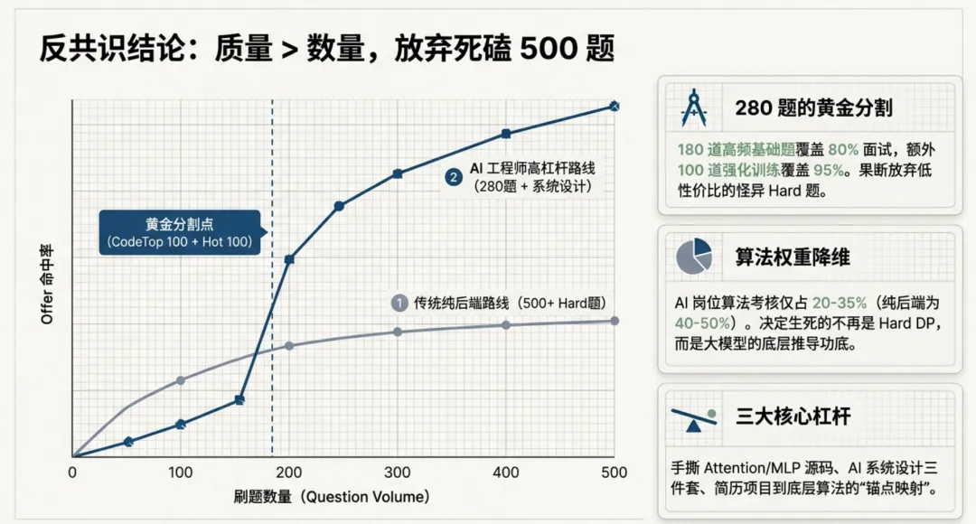 第一,不要追 500 题。对 LangGraph + RAG + HITL 背景的 AI 工程师,280 题精刷 + 20 道 LLM 手撕 + 3 套系统设计 + 简历深挖演练的投入组合,比死磕 500 题 LeetCode 更容易拿到 AI 初创 offer——因为算法只占你面试权重的 25%,项目和系统设计占 60%。