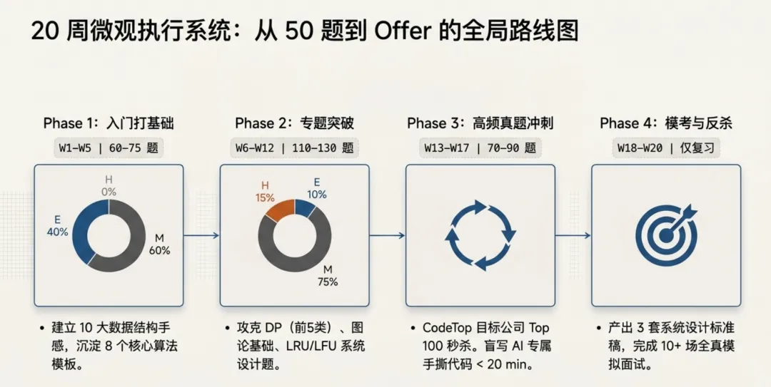 | Phase 1 · 入门打基础 | W1–W5 | 60–75 题(Easy 40%、Medium 60%、Hard 0%) | 建立 10 大数据结构手感 + 8 个算法模板 | 数组/链表/哈希/栈/队列/二叉树/BFS-DFS/二分/双指针/回溯 模板化 |