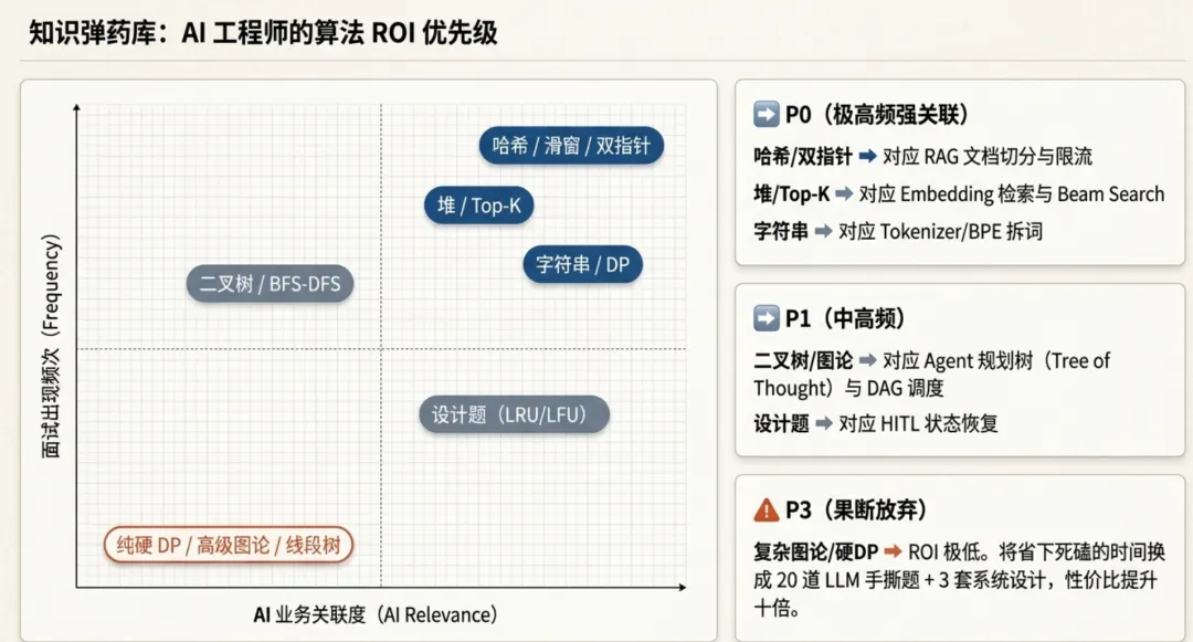 | P0 | 堆 / Top-K(LC 215、347、703、295) | Embedding Top-K 检索、Beam Search 内部逻辑 | RAG 召回、生成采样 |