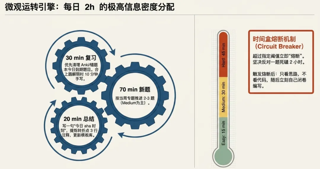 总结 20 min:更新错题本,写一句"今日 aha 时刻",更新模板库。