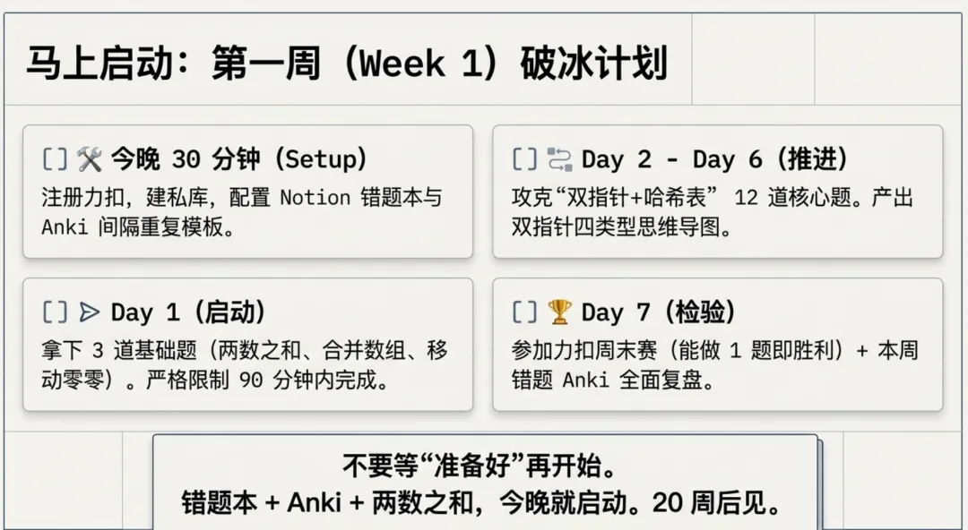 明天开始,不要等"准备好"——错题本 + Anki + LC 1 两数之和,今晚就启动。20 周后见。