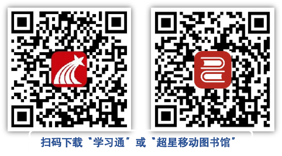 手机应用商店搜索“学习通/移动图书馆 ”APP或者扫描下方二维码下载安装“超星学习通/超星移动图书馆”APP。