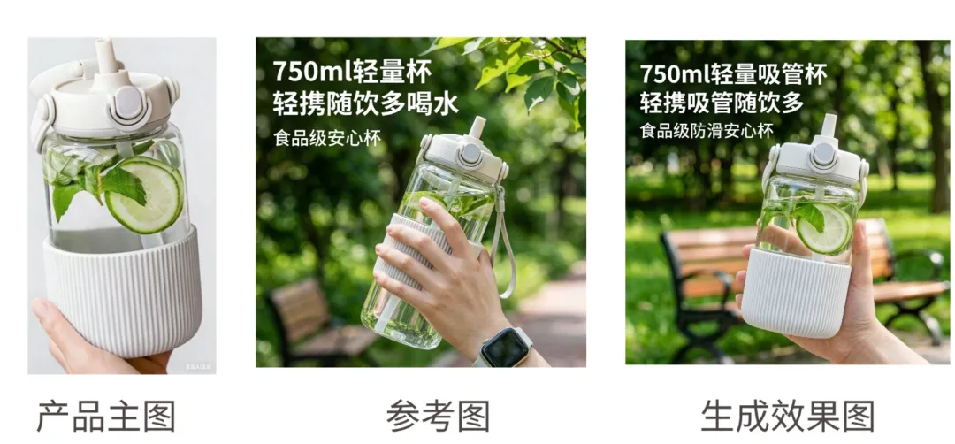 第三,把产品放进参考图的场景,光影重新渲染,卖点文案原创生成,一张全新的主图就出来了。