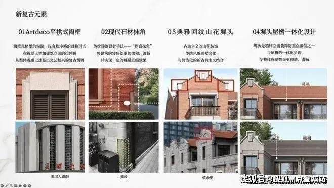 源自石库门鼻祖张园的灵感,提取现代石材抹角的新复古元素。同时凝萃Artdeco平拱式窗框、经典回纹山花墀头、墀头屋檐一体化设计,擘画风貌别墅的新复古主义风情。