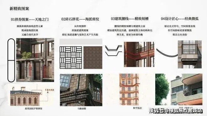 复刻马勒别墅的海派席纹砖石拼花,雕琢顶豪别墅的气场。天地之门拱券图案、精致刻槽建筑腰线、邬达克式经典微弧,勾勒风貌别墅的新精致主义格调。
