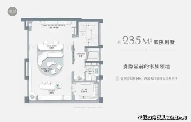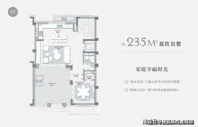 以建面约235㎡的庭院别墅样板房为例,户型附赠地下室、庭院、露台、阁楼空间,附赠面积达到户型总建面的60%左右,市场上少之又少!