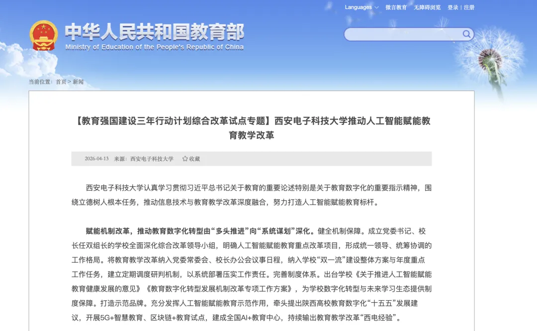 核心成效:建成全国 AI + 教育中心,“西电智课” 平台覆盖全国 1200 余所高校;构建全链条学生成长评价体系,心理智能预警准确率超 90%;形成 “西电经验” 并牵头陕西高校教育数字化 “十五五” 规划建议,获批教育部 “人工智能 + 高等教育” 应用场景典型案例