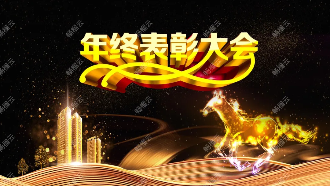 专为XX集团17年年会打造的年终表彰大会PPT演示文稿,以华丽大气的视觉风格,成为烘托颁奖氛围、展示集团发展成果的核心载体。封面以黑色为底搭配金色光斑与粒子效果,中央立体金色“年终表彰大会”字样搭配红色衬底与黄色飘带,左下角金色高楼与树木象征产业根基,右侧金色光点构成的奔马呼应集团发展节奏;内容包含专属回顾环节,系统梳理集团在市场拓展、技术研发、团队建设等领域的关键性突破,兼具视觉美感与实用价值。